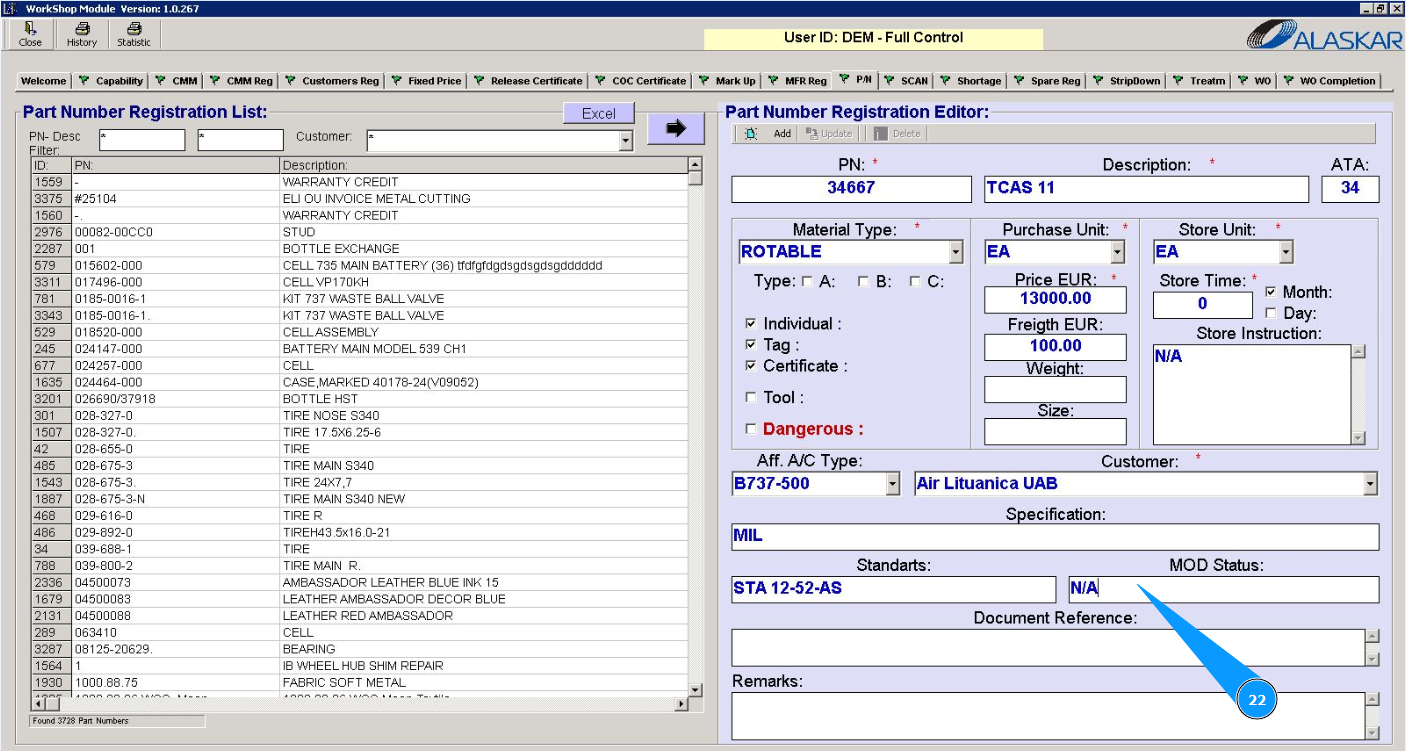 22. If necessary, enter the component modification number in the field "Mod. Status".
