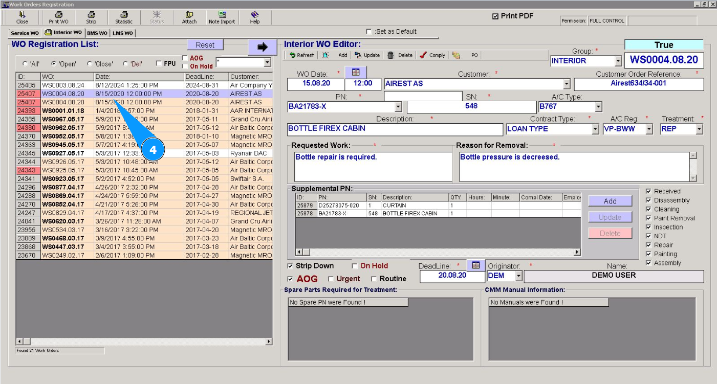 4. Select the required one from the list of work orders in the window "WO Registration List". Click on the corresponding line. Note: Use the available filters if necessary.