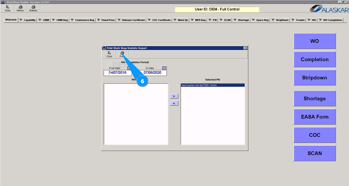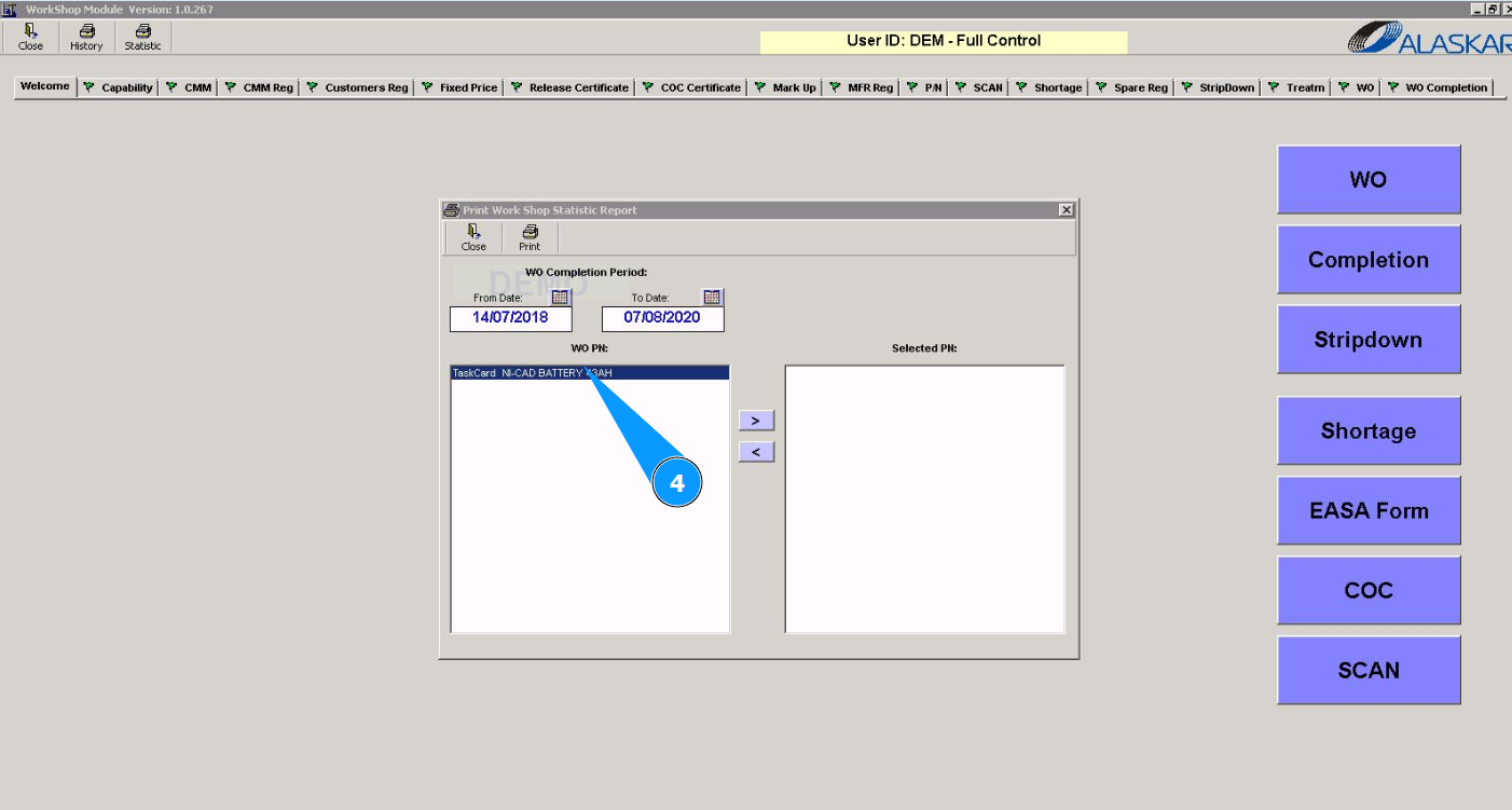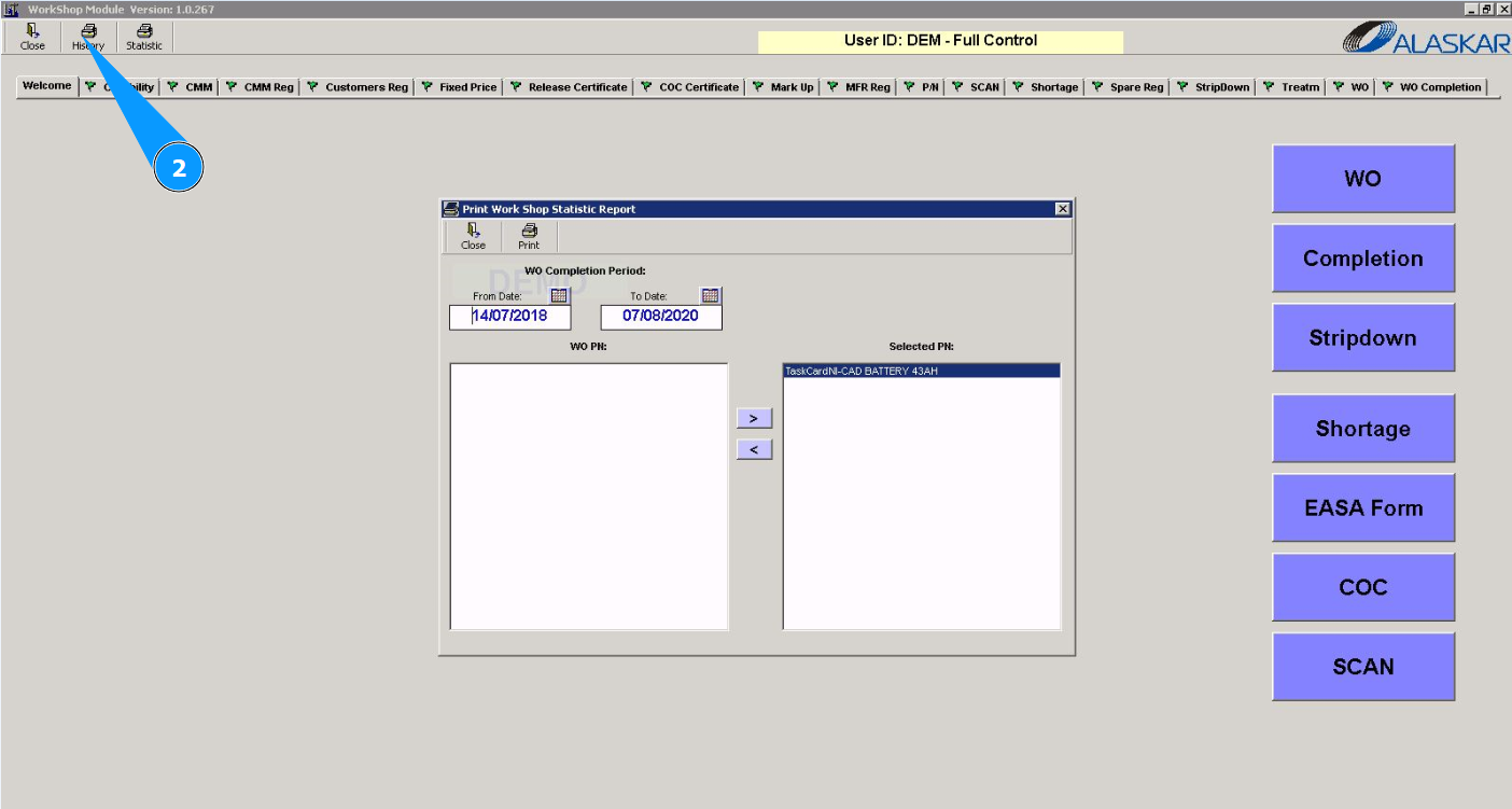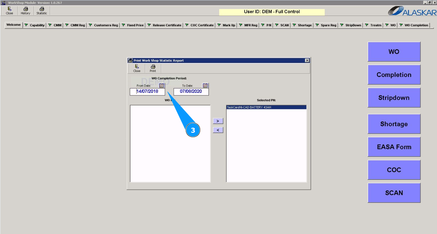 3. Select the required dates to check the history in the window "WO Completion Period".