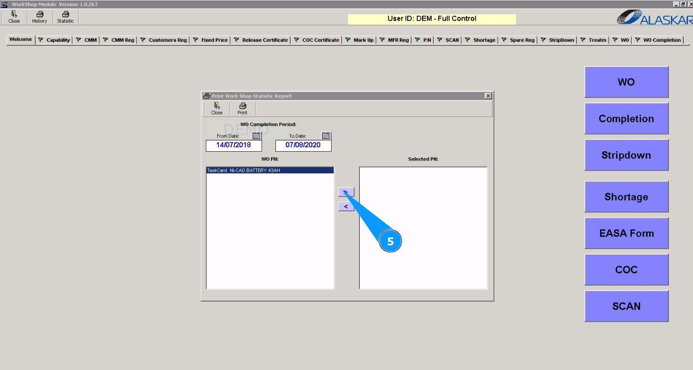 5. Click on the button with the arrow to move the WO to the window "Selected PN".