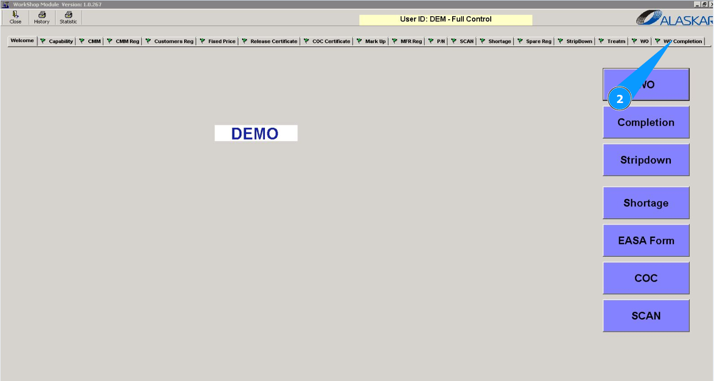 1. In order to close a work order for base maintenance (Base Maintenace Shop WO), go to the module "Workshop".