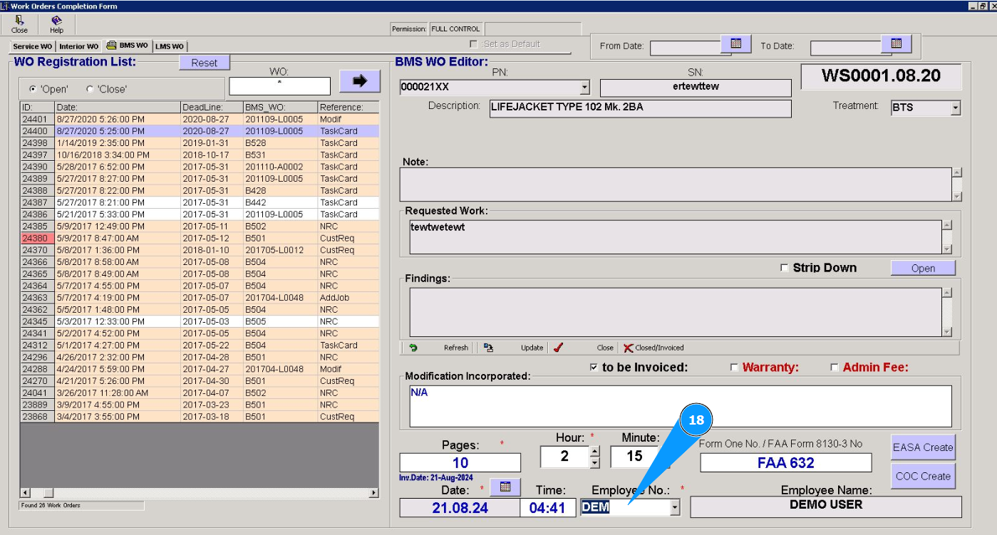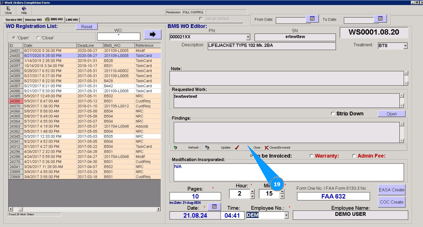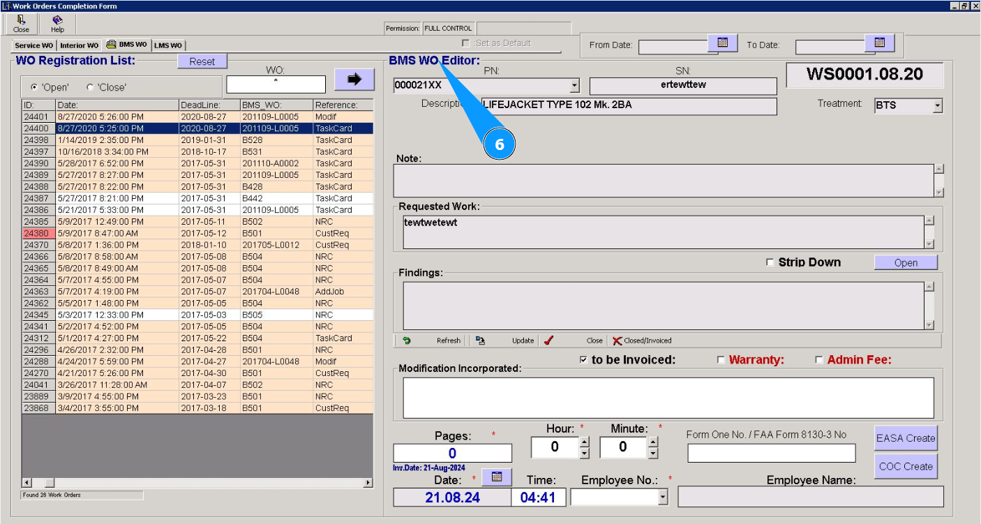 6. Check that the editor has opened in the window "BMS WO Editor" and the work order required to be closed is displayed.