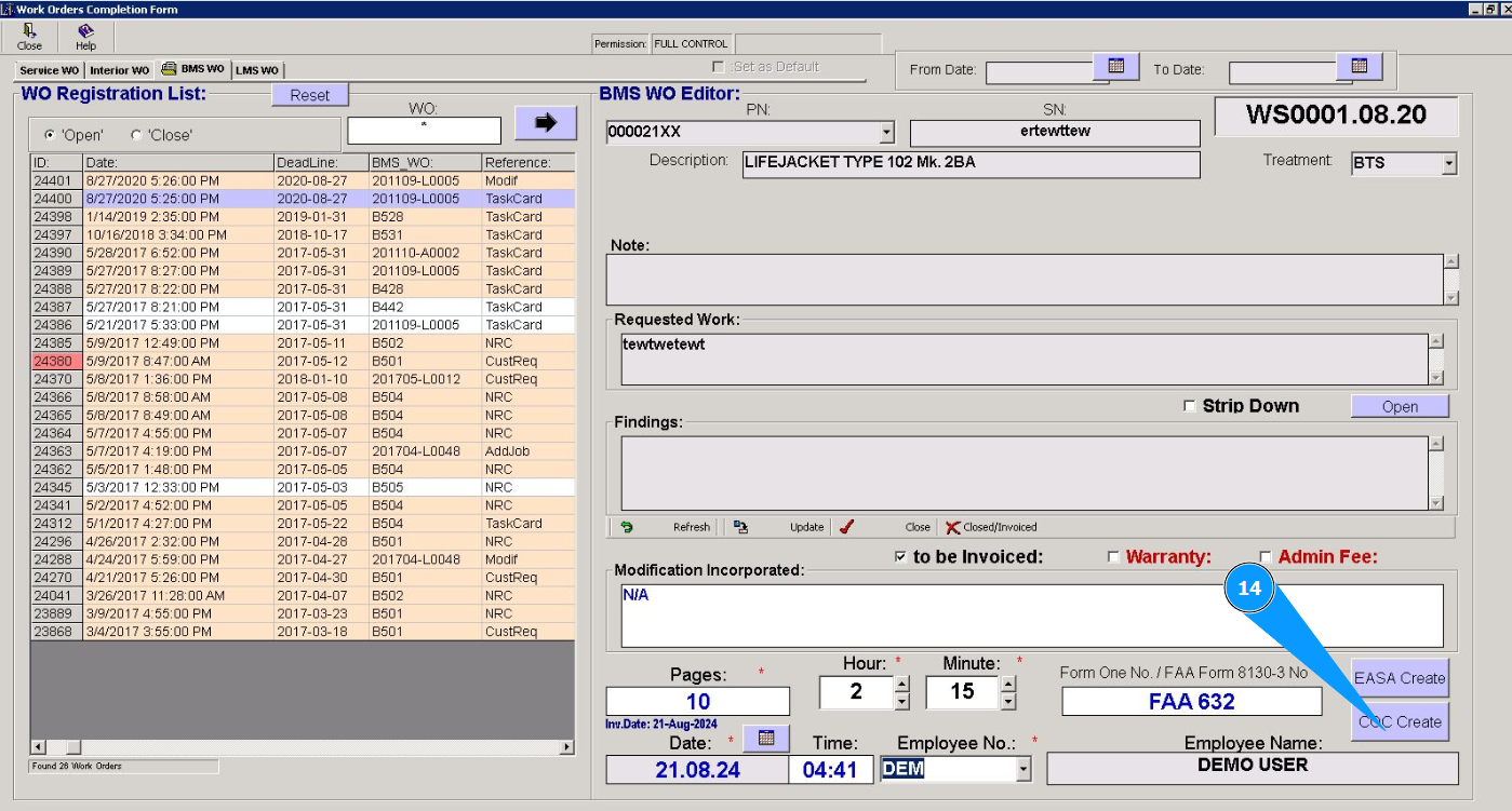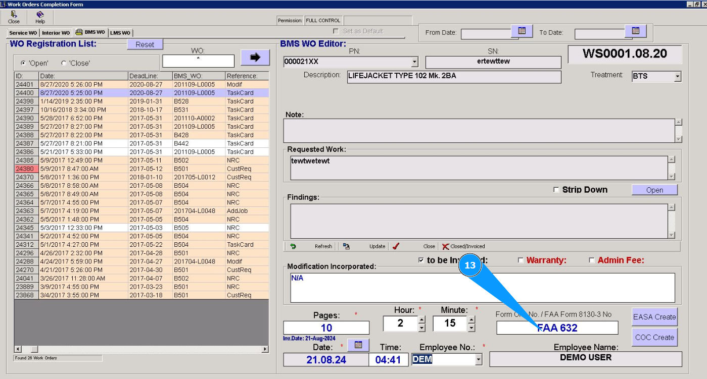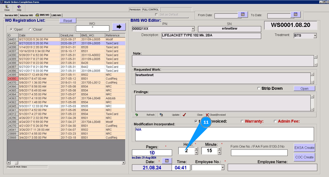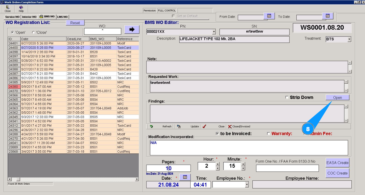 6. Check that the editor has opened in the window "BMS WO Editor" and the work order required to be closed is displayed.
