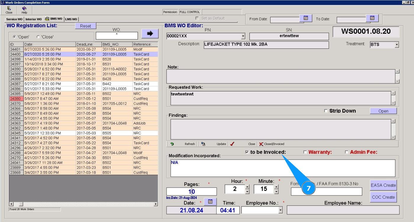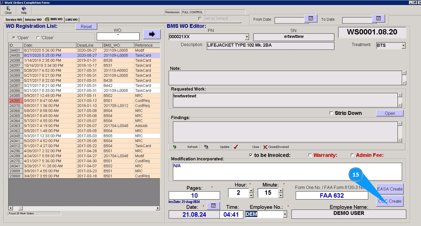 21. Check that the closed WO disappears in the window "WO Registration List".