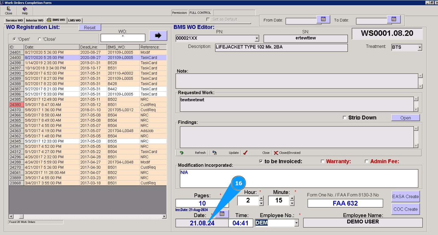 16. Select the date of work order from the calendar in the field "Date".