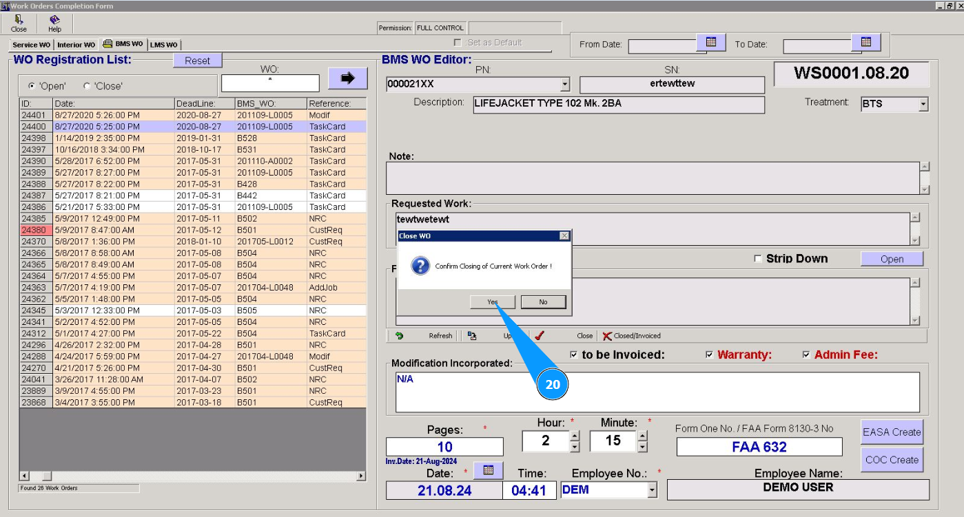 20. Click on the button "Yes" to confirm closing Base Maintenace Shop WO.