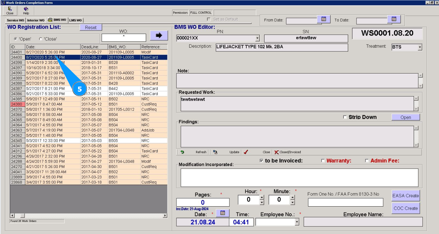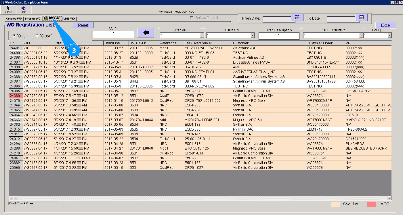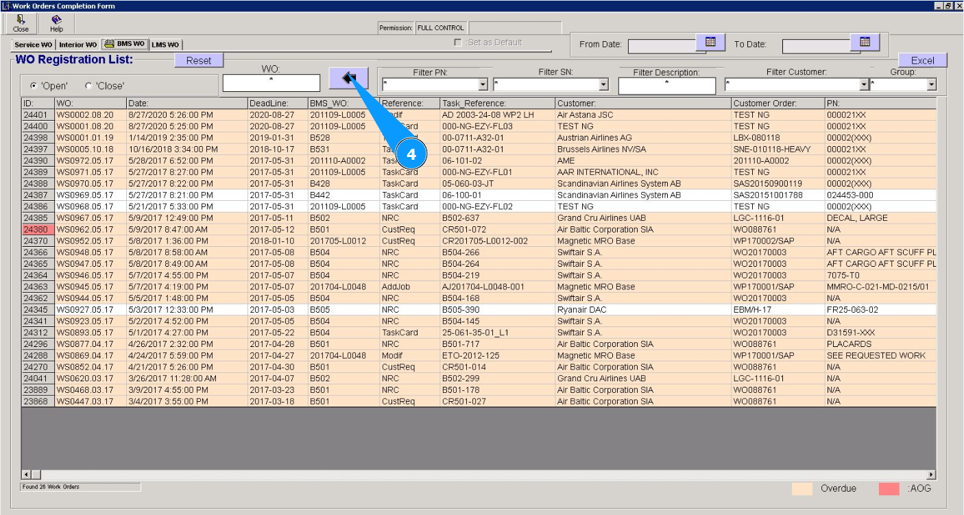 5. Select the required work order from the list in the window "WO Registration List". Click on the corresponding line. Note: Use the available filters if necessary.