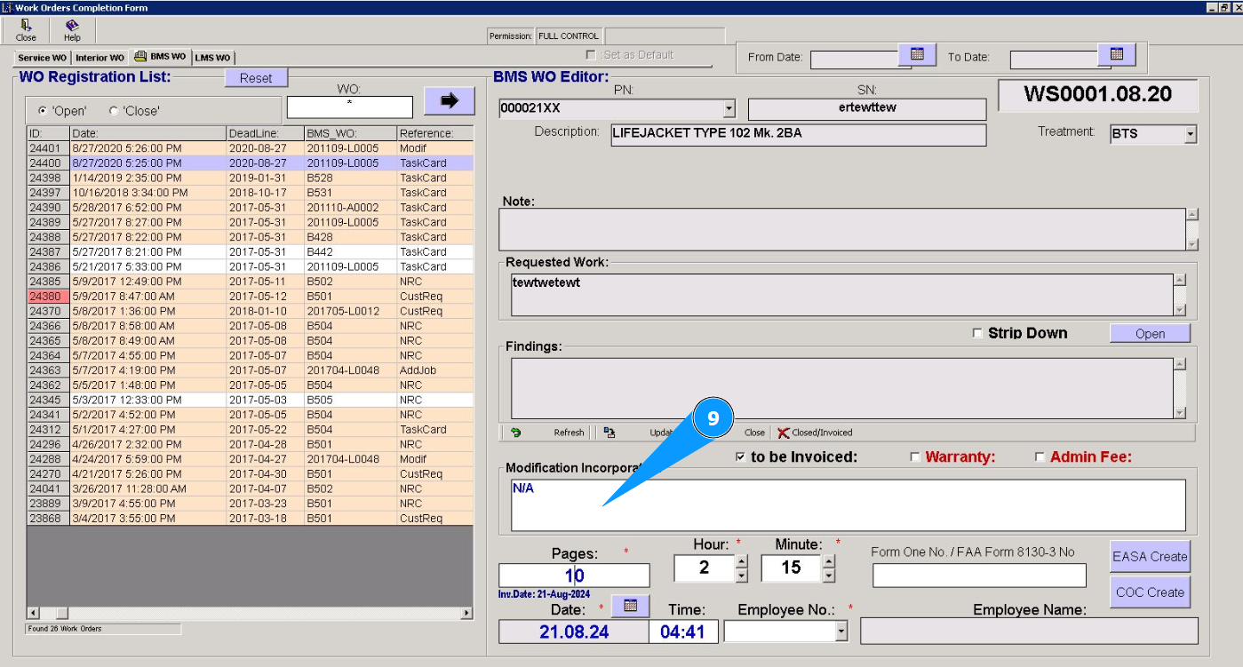 9. Enter the modifications made during the work in the field "Modification Incorporated".