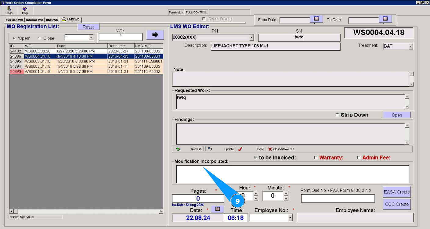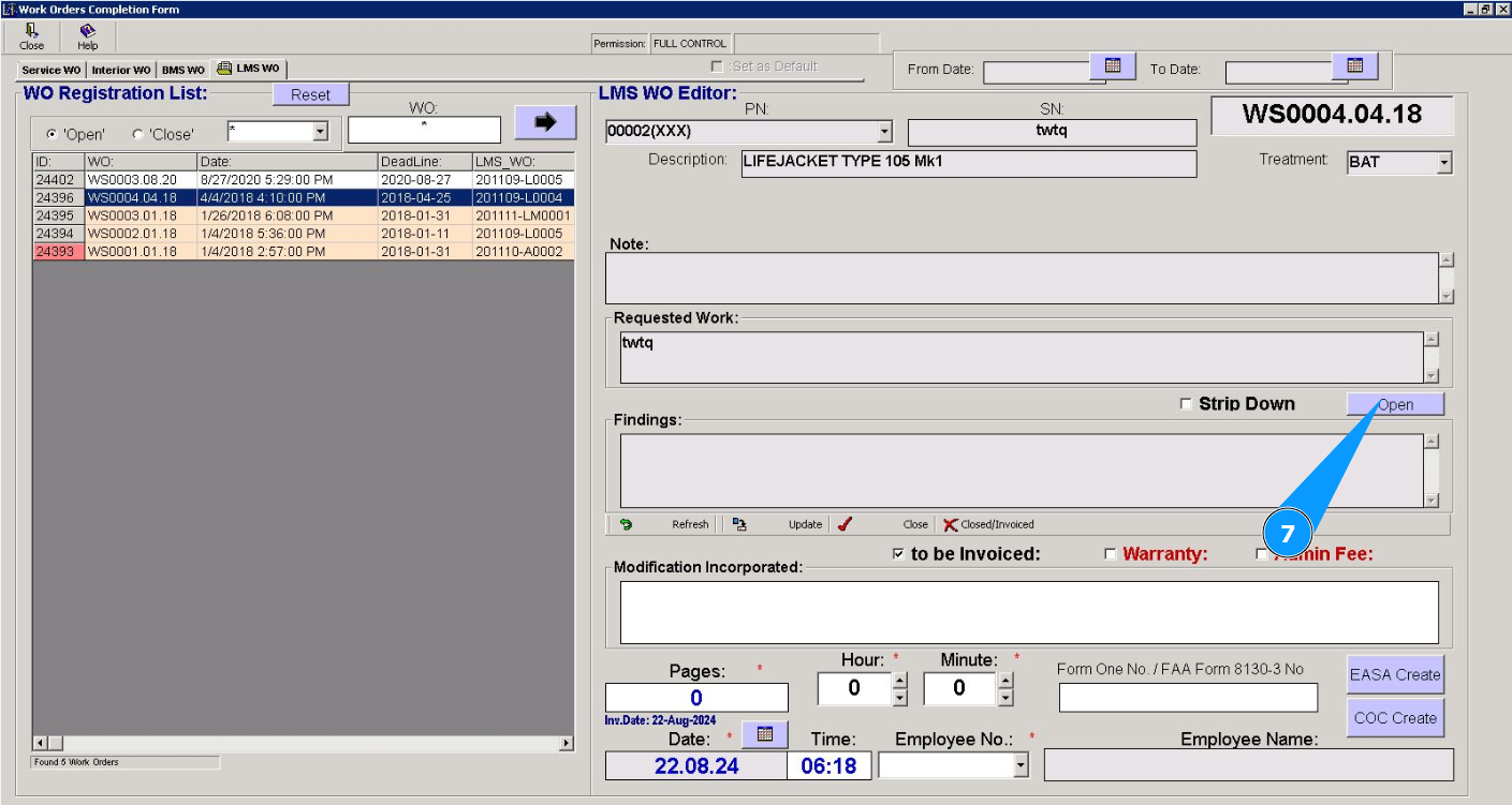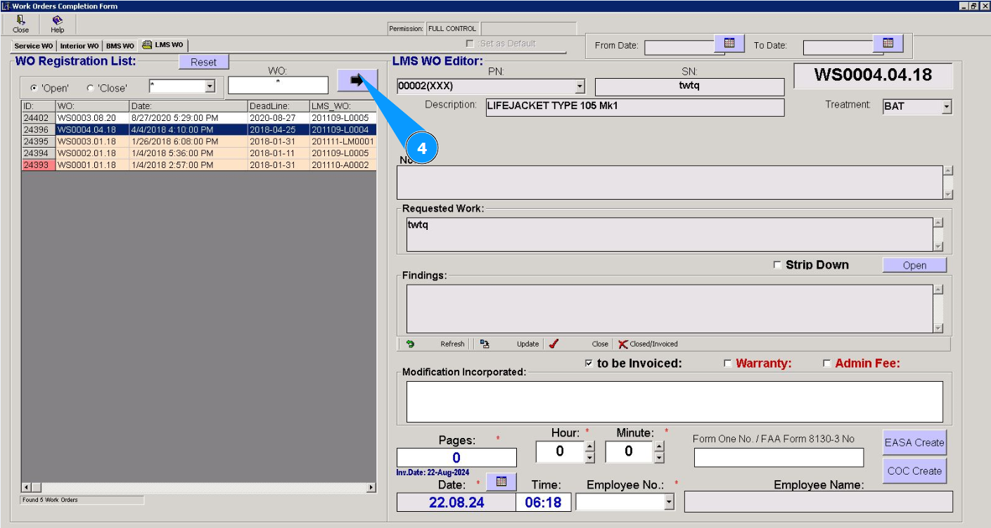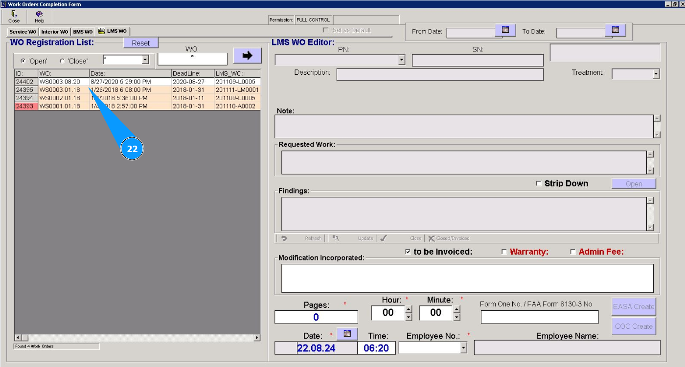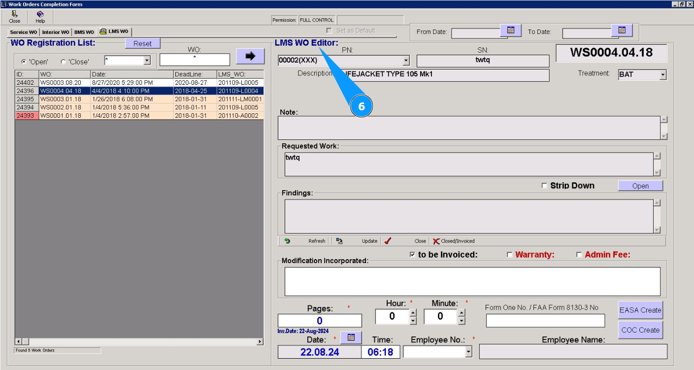 6. Check that the editor has opened in the window "LMS WO Editor" and the work order that needs to be closed is displayed.