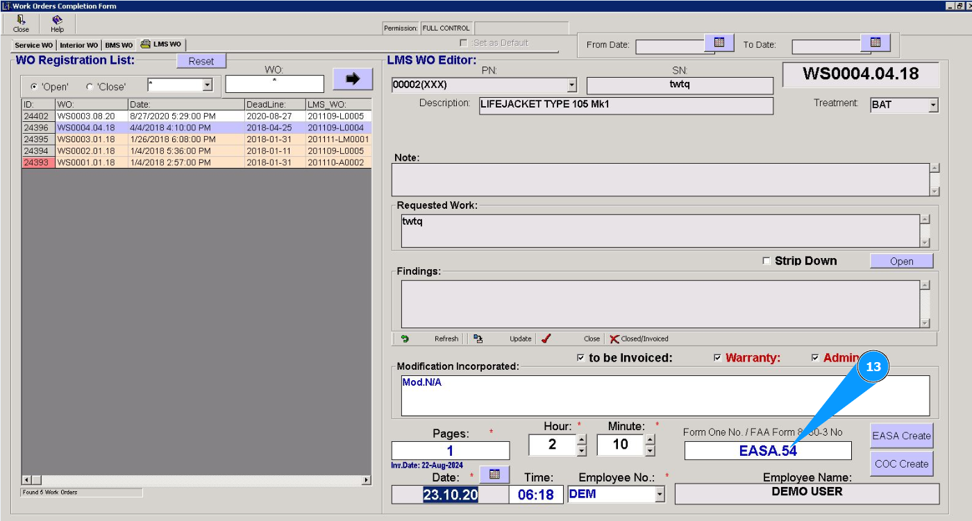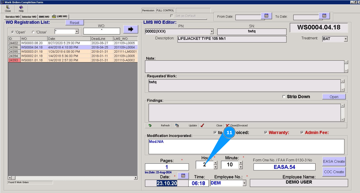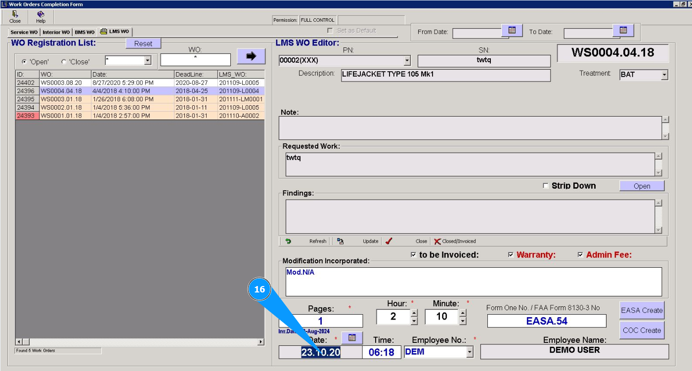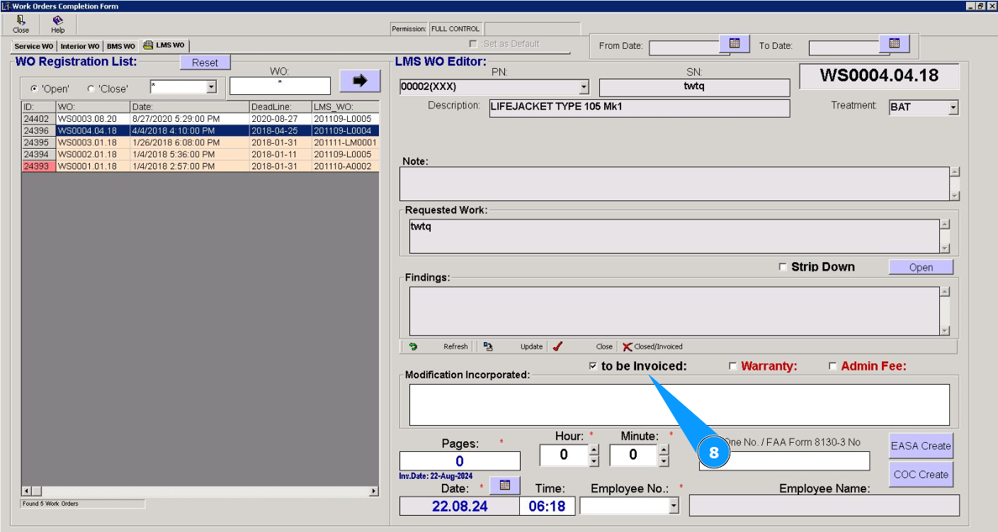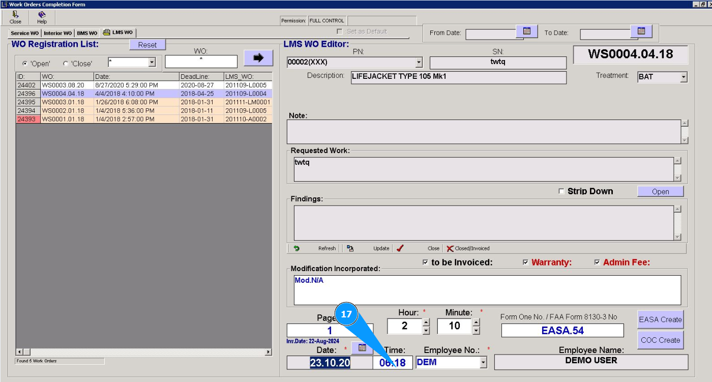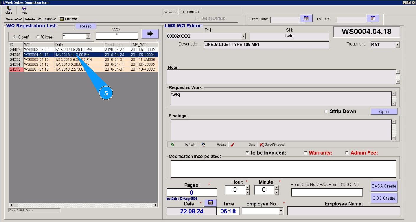 6. Check that the editor has opened in the window "LMS WO Editor" and the work order that needs to be closed is displayed.