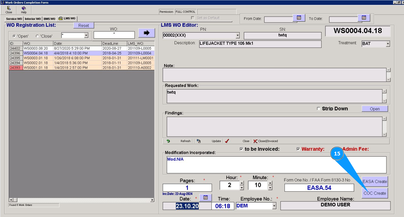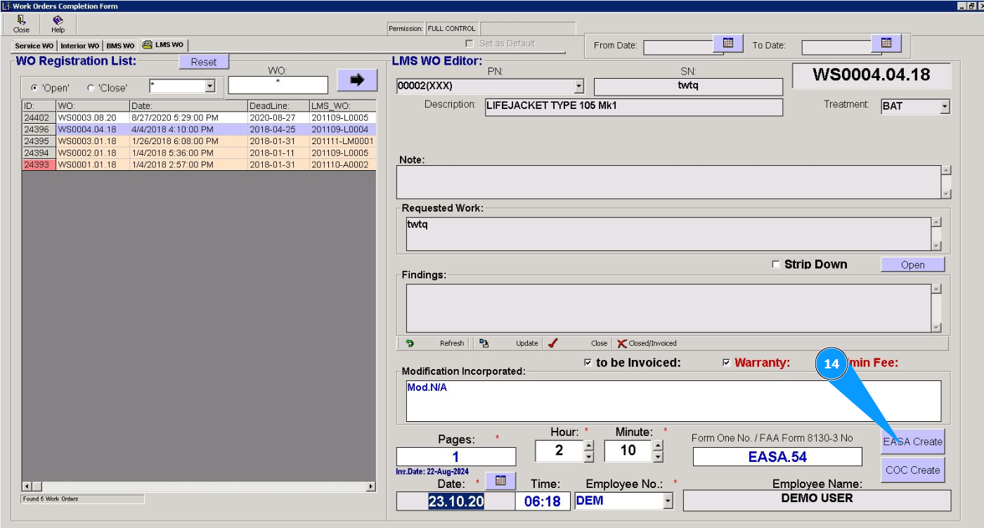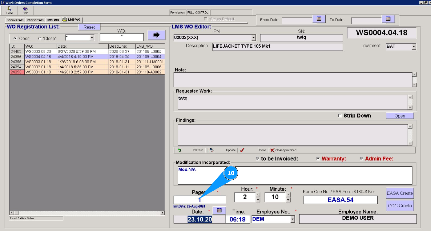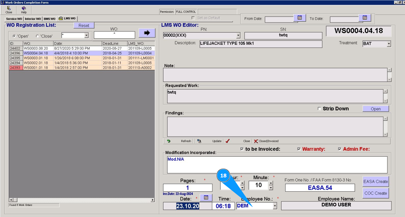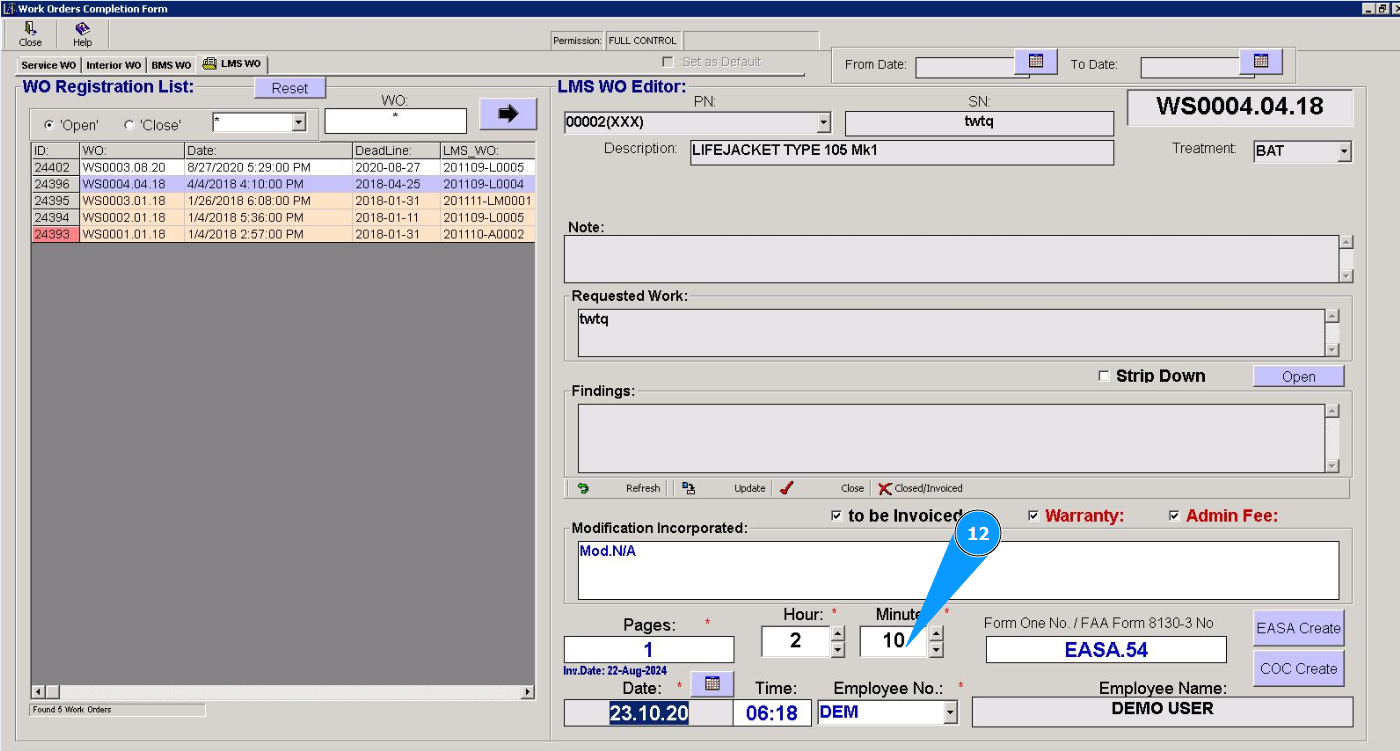 6. Check that the editor has opened in the window "LMS WO Editor" and the work order that needs to be closed is displayed.