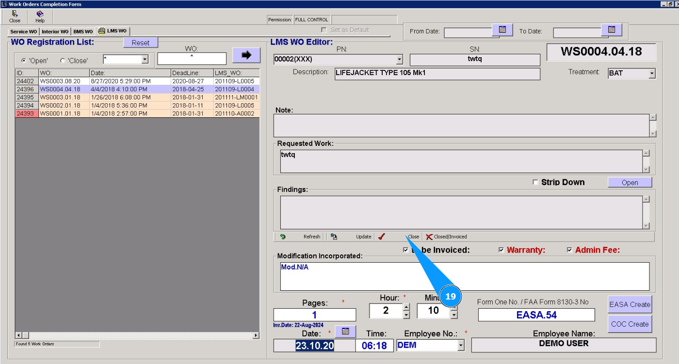How to close the work order for line maintenance (Line Maintenance Shop WO)