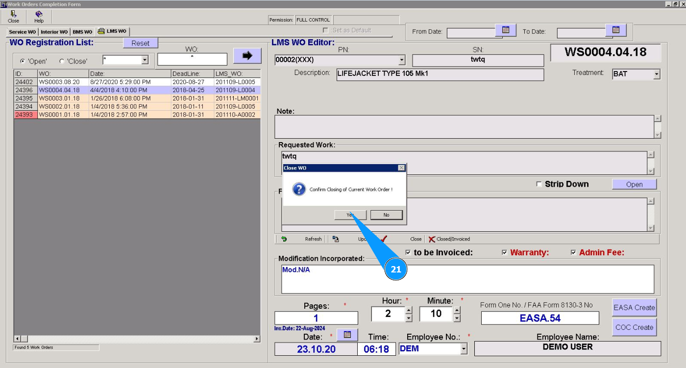 20. Click on the button "Yes" to confirm closing the Line Maintenance Shop WO.