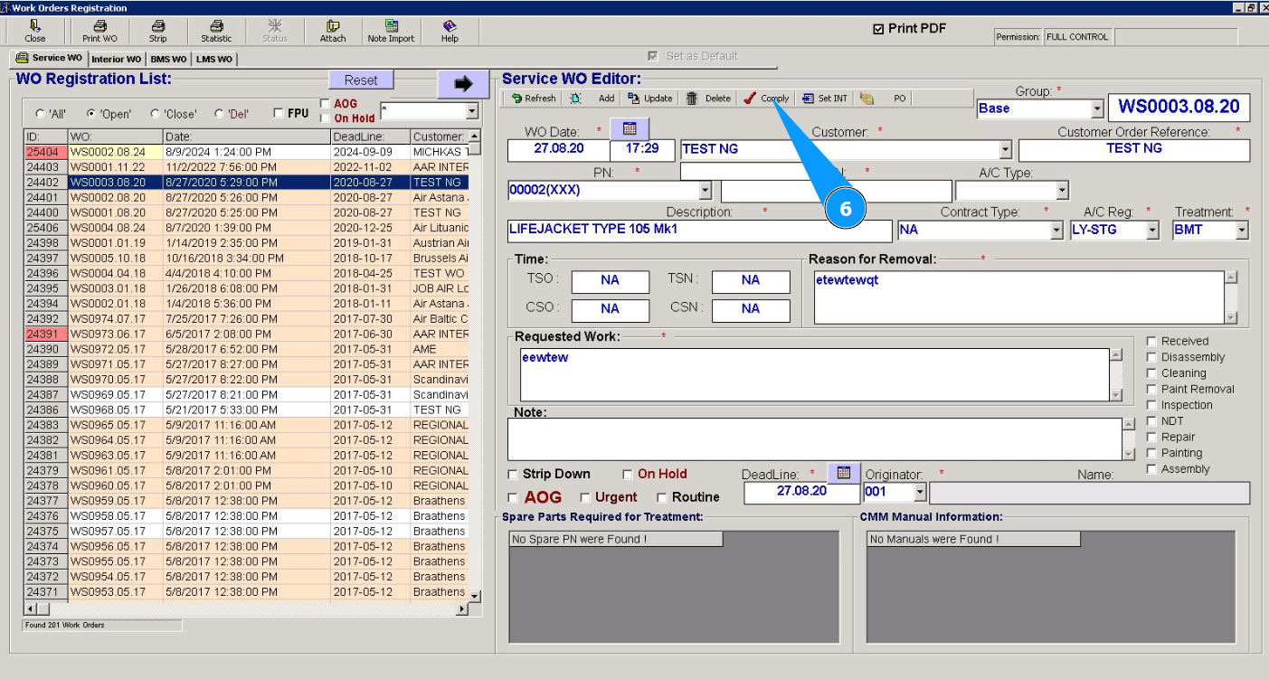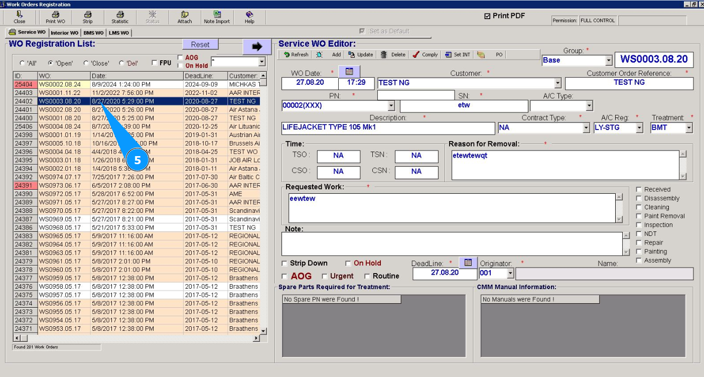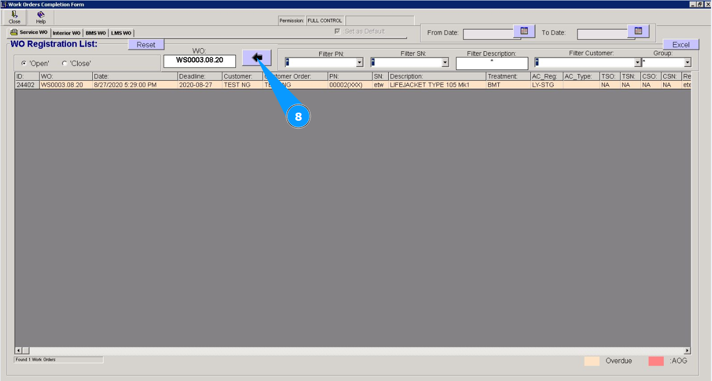 5. Select the required one from the list of work orders in the window "WO Registration List". Click on the appropriate line. Note: Use the available filters if necessary.