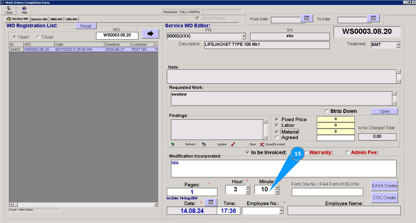 15. Enter the man-hours spent in minutes in the field "Minute".