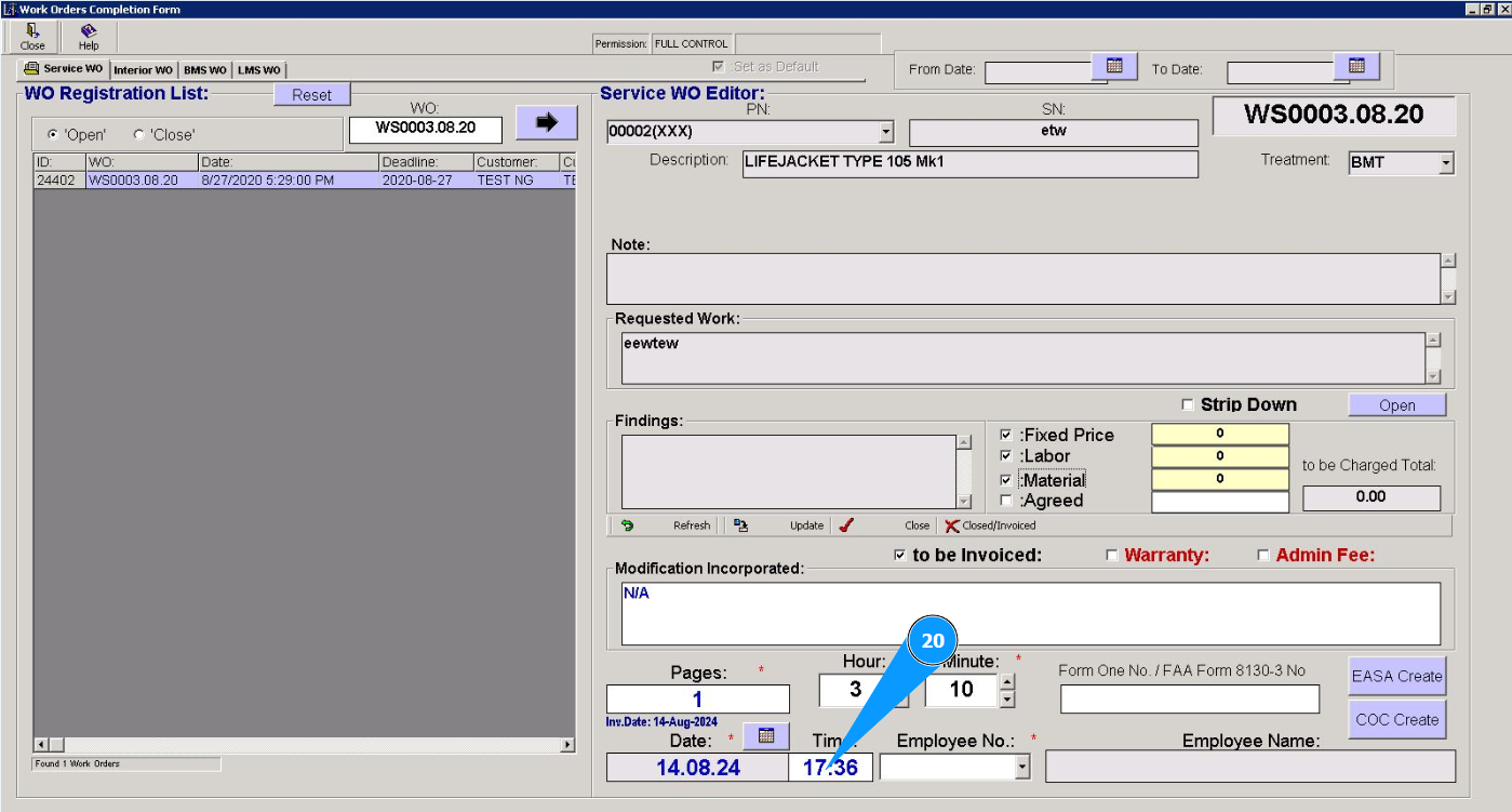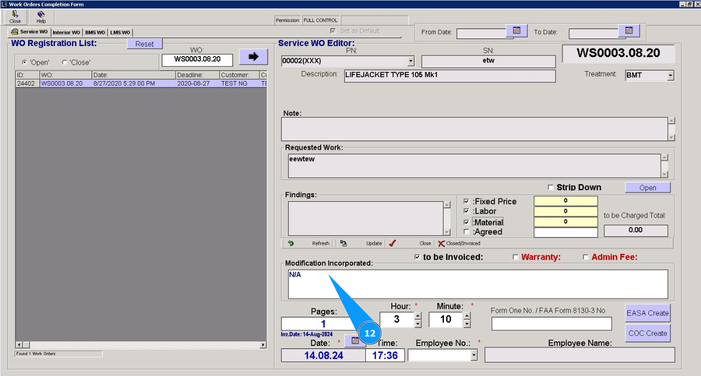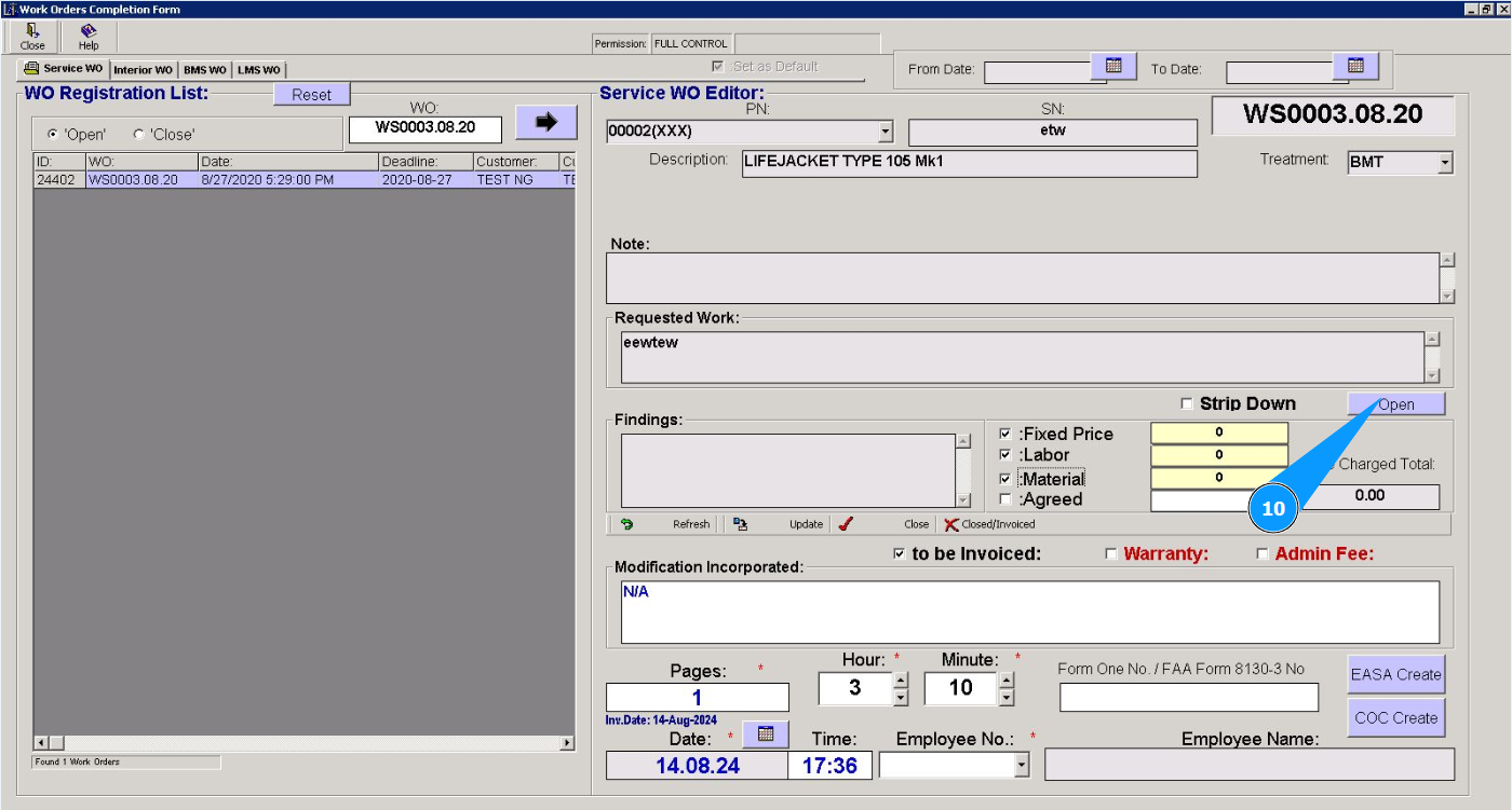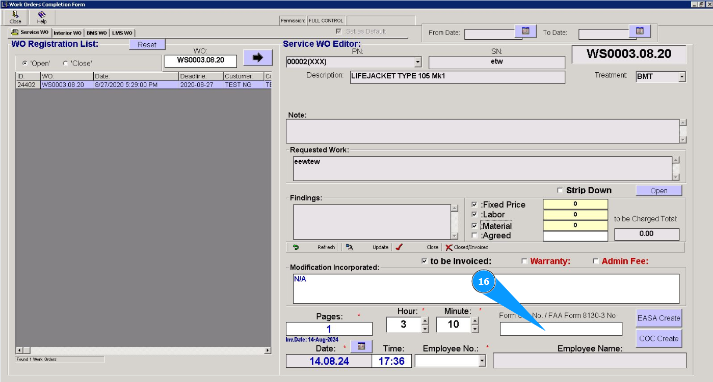 7. Make sure that the editor opens in the window "Work Order Completion Form".