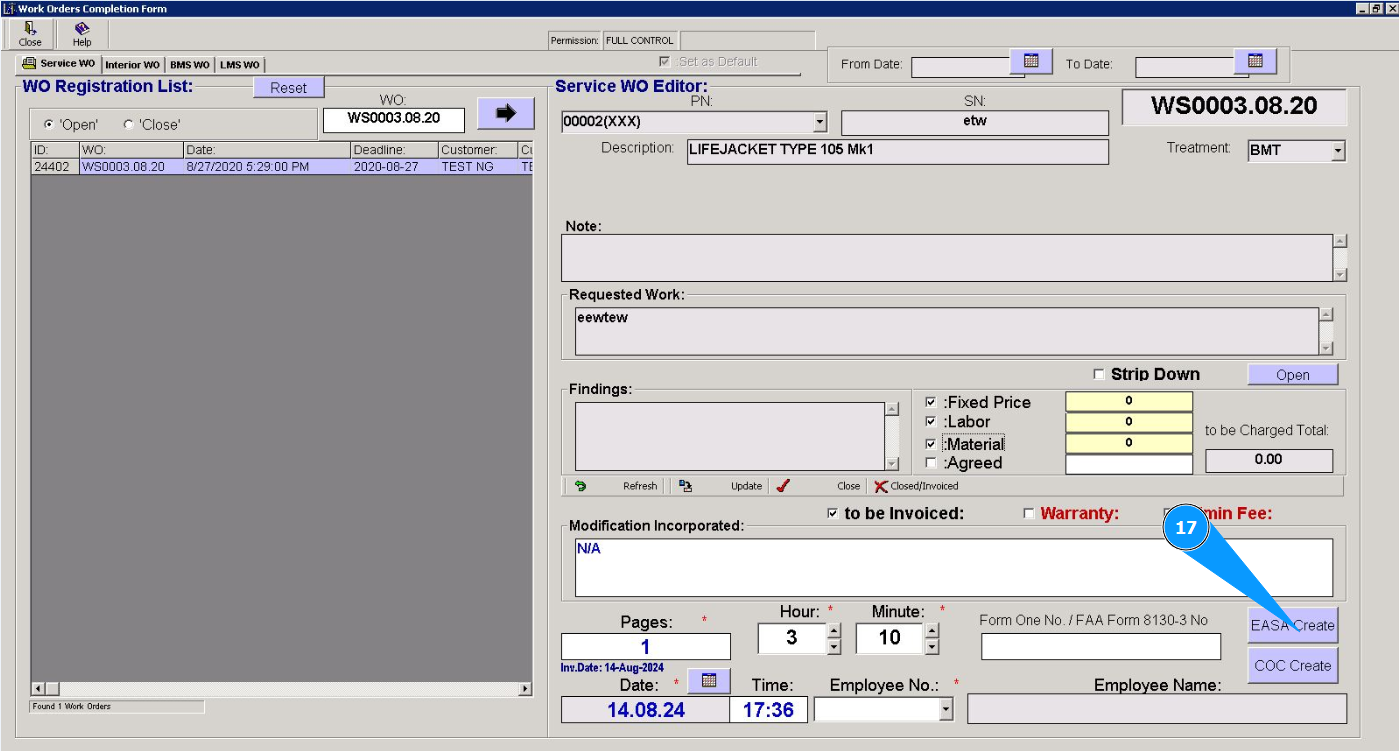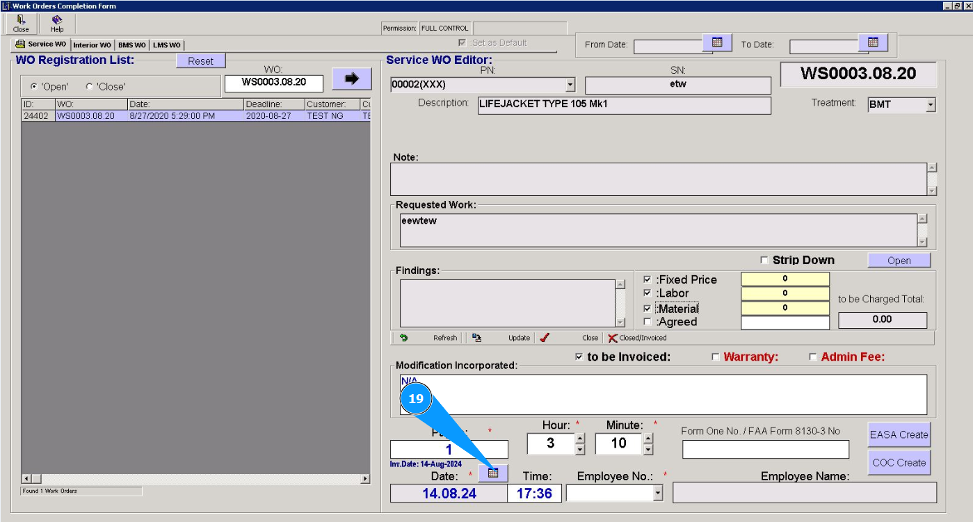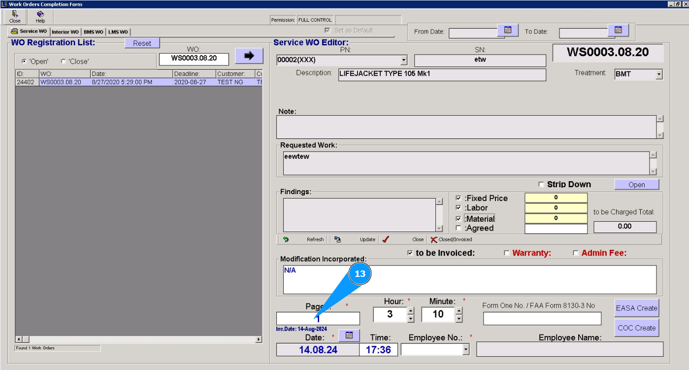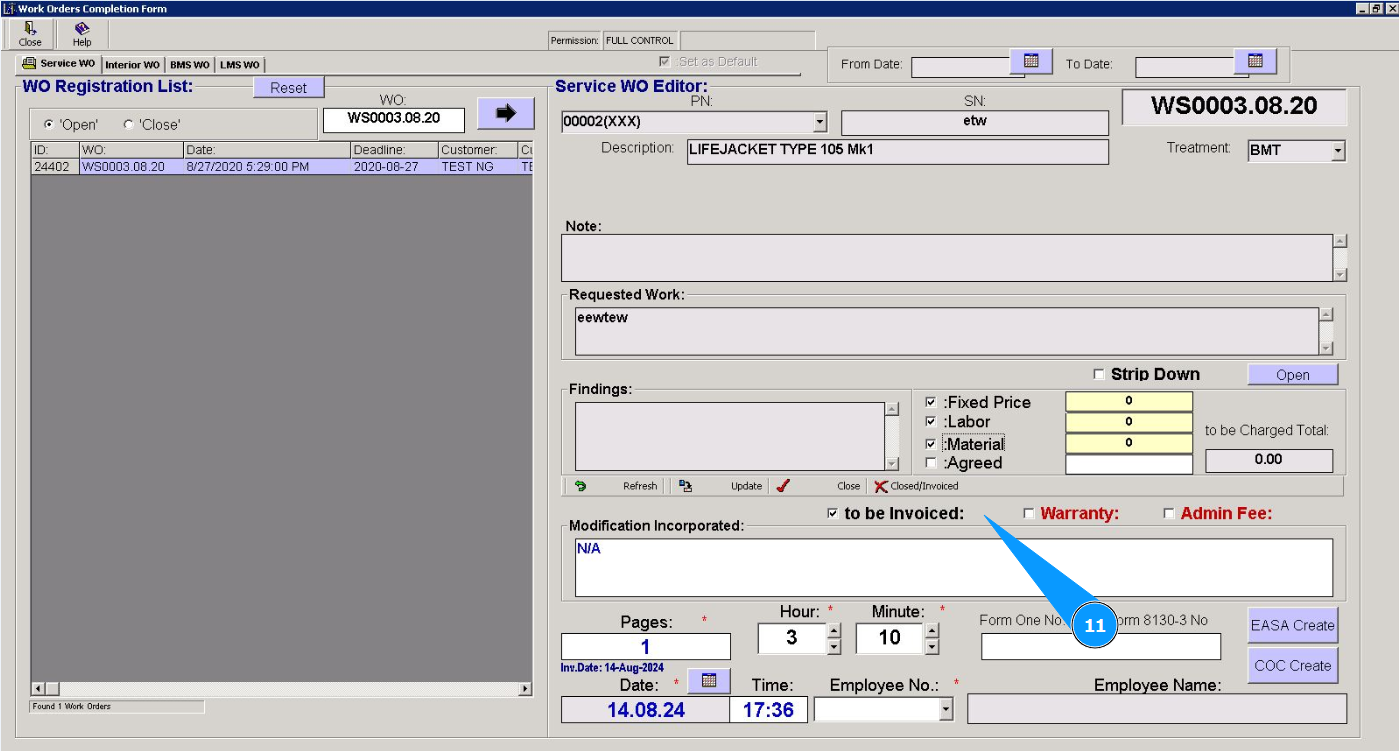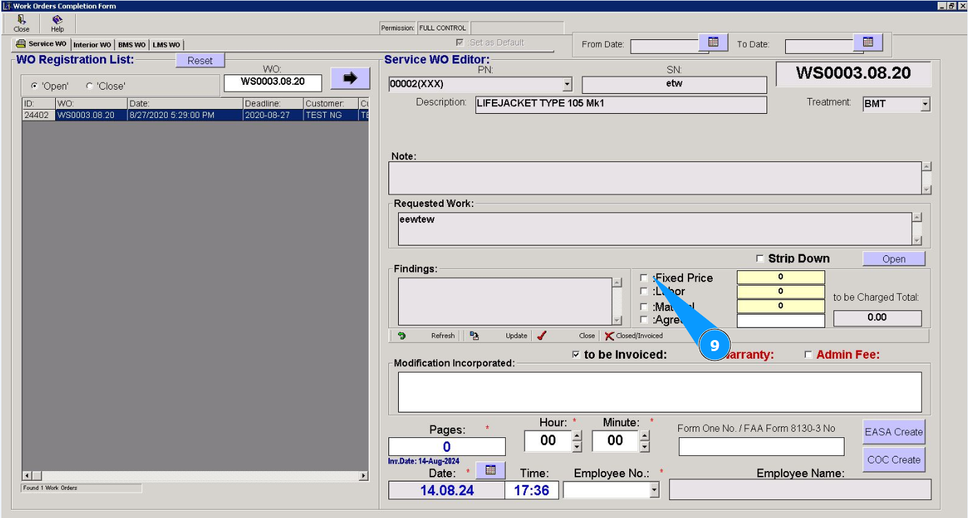 7. Make sure that the editor opens in the window "Work Order Completion Form".