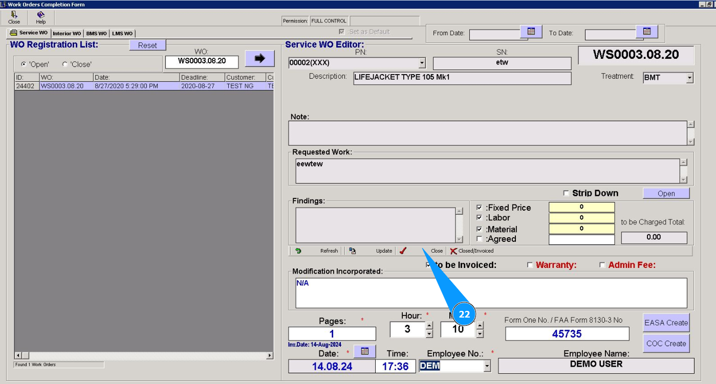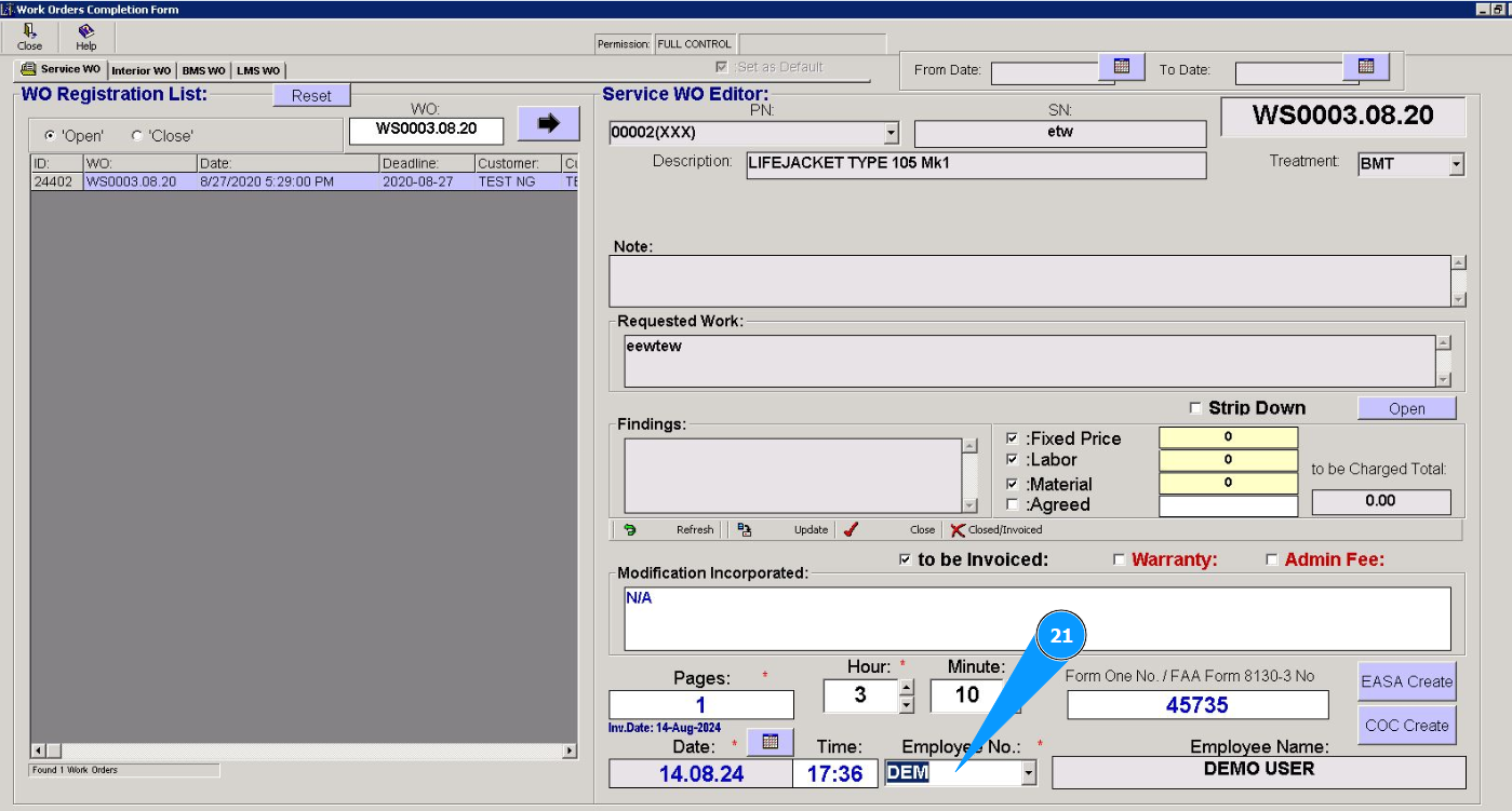 21. Select from the dropdown list the initials of the performer or the one who closes the WO (in accordance with your company's policy) in the field "Employee No.". Note: Emploee's name will be displayed automaticaly in the field "Emploee Name".