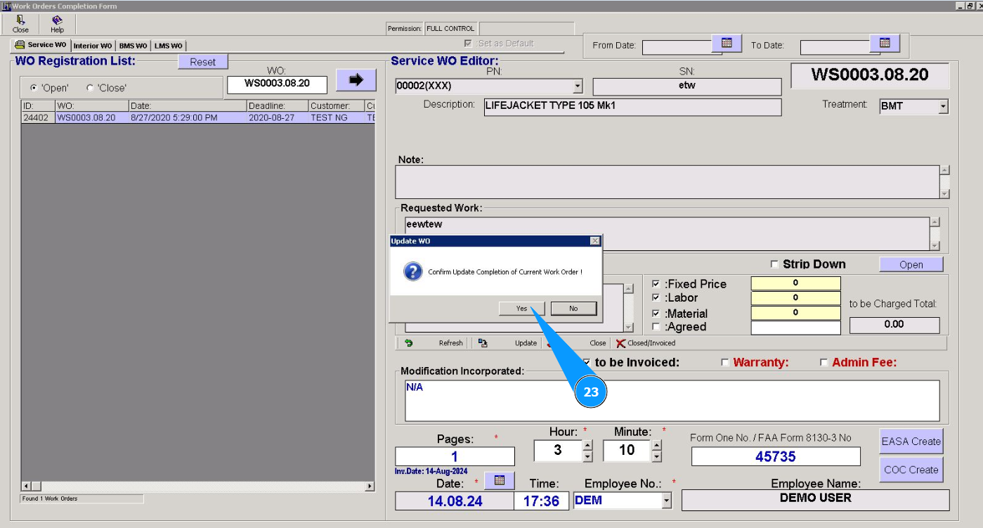 23. Click on the button "Yes" button to confirm closing Service WO in the program.