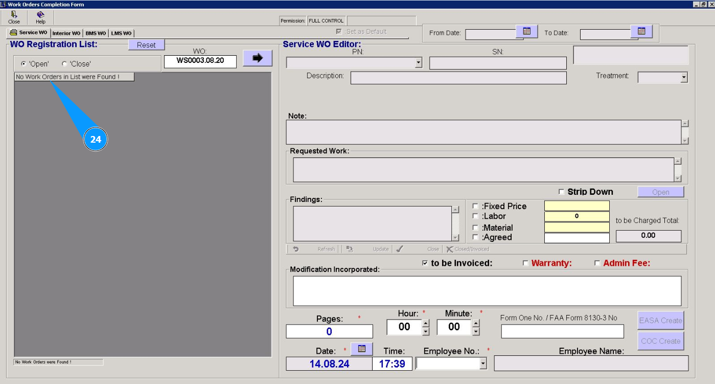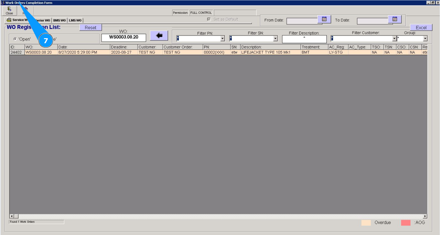 24. Check the disappearance of the entry with a closed WO in the window "WO Registration List".