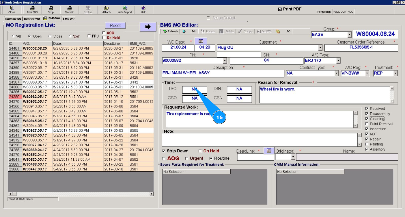 16. If necessary, enter the operating time of the component since the last major overhaul in hours in the field "TSO".