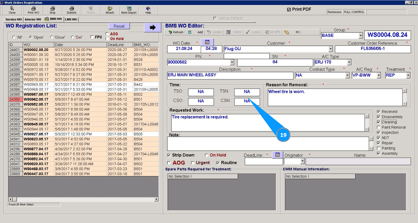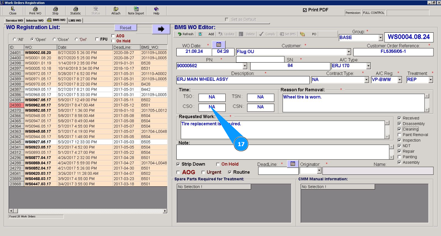 17. If necessary, enter the operating time of the component since the last major overhaul in cycles in the field "CSO".