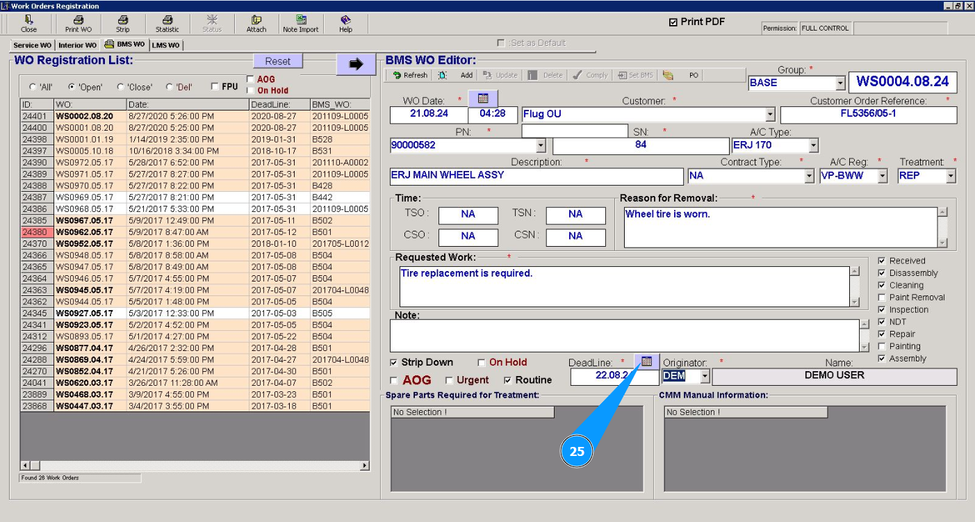 5. The creation date of Base Maintenace Shop work order is set to today's date by default. If necessary, change it in the calendar. Note: The work order number will be created automatically by the program.