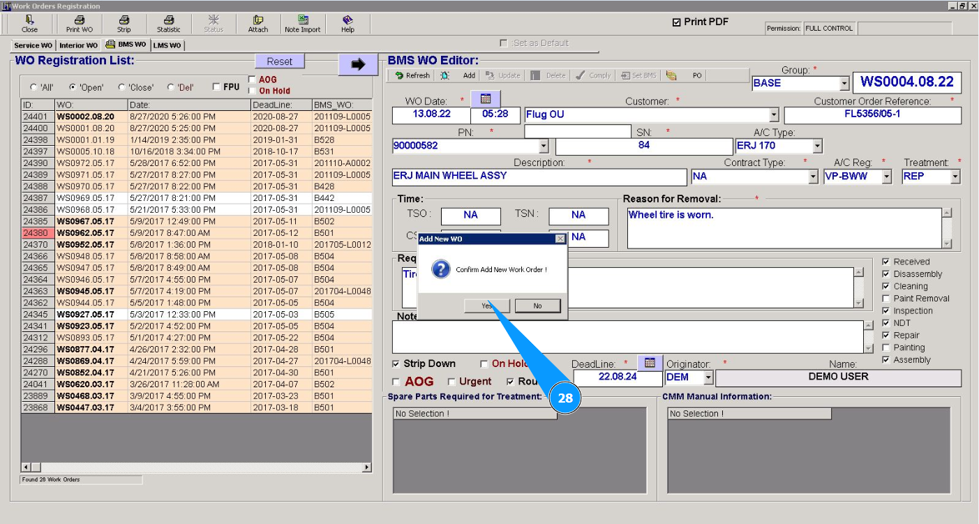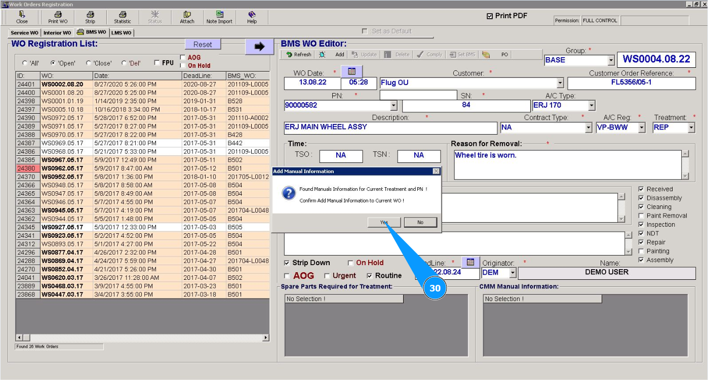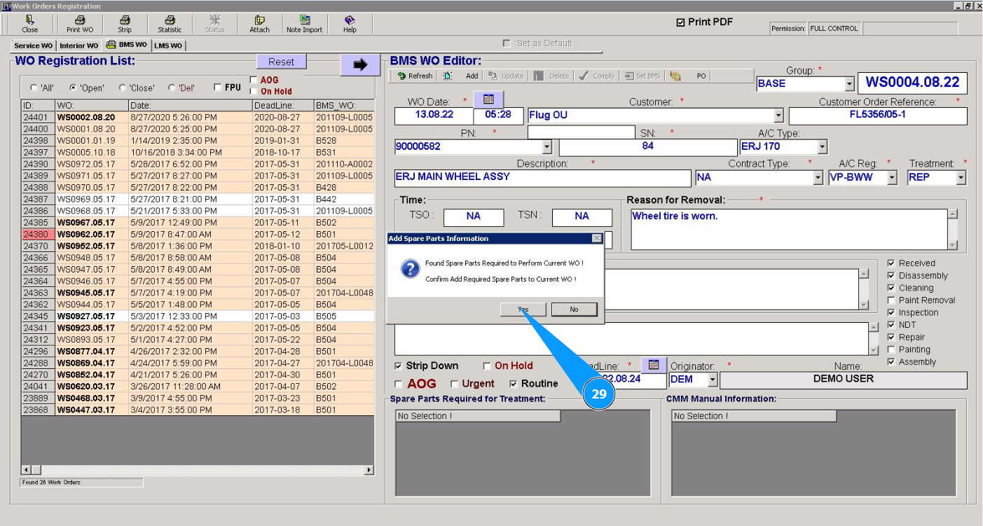 29. Click on the the button "Yes" to confirm the addition of previously entered spare parts to this work order.