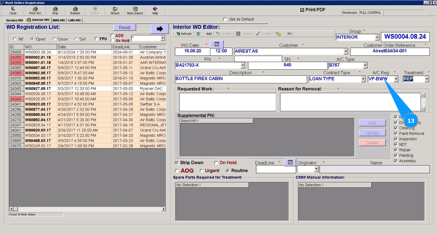 13. Select the aircraft registration number from the dropdown list in the field "A/C Reg..