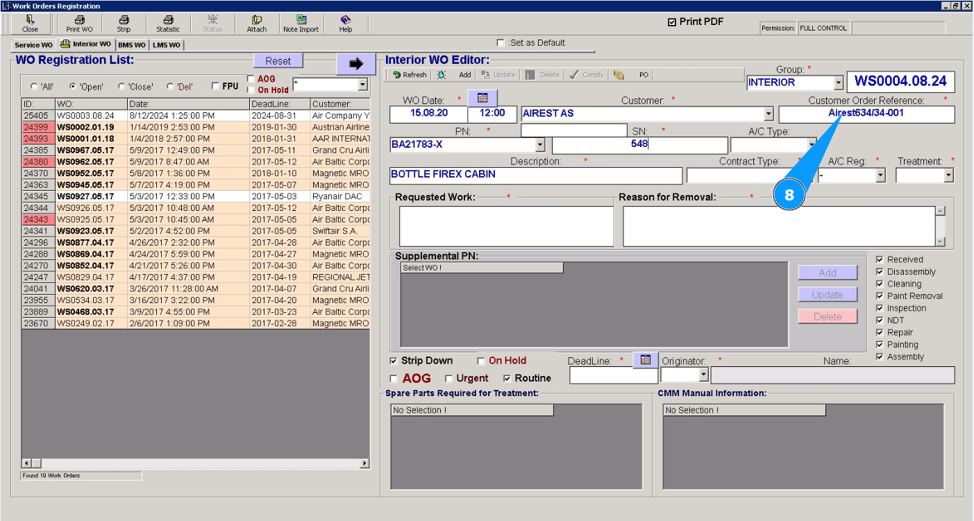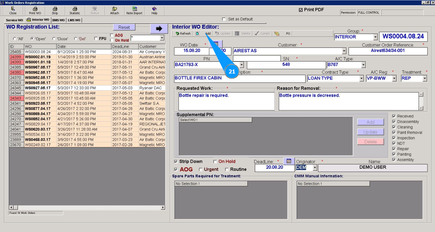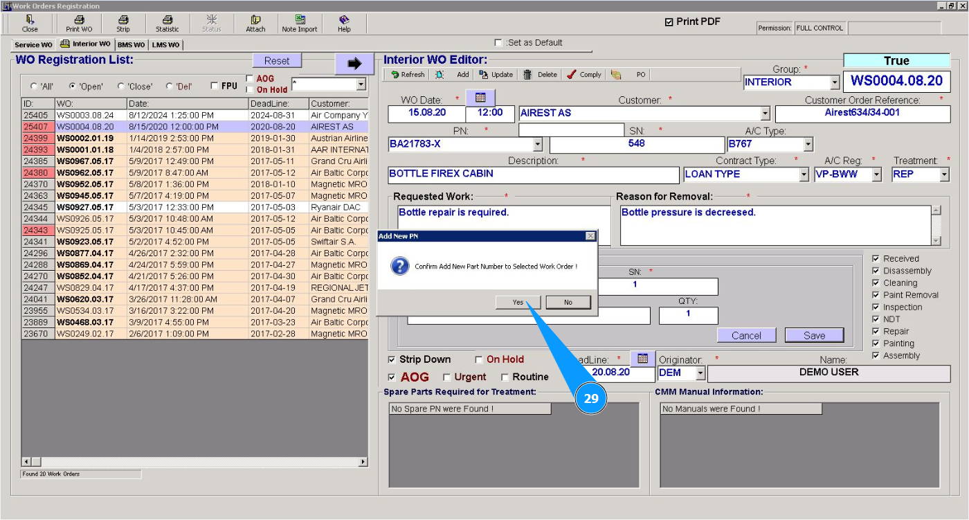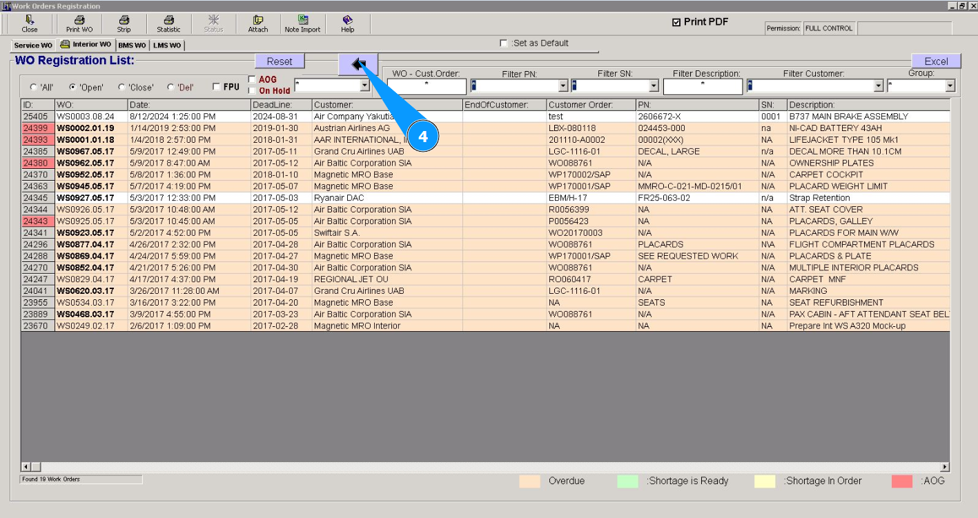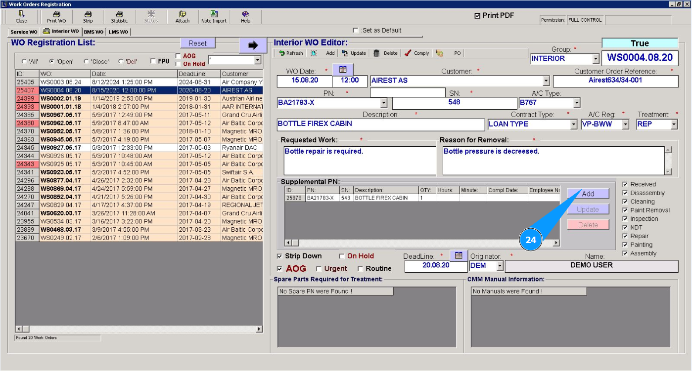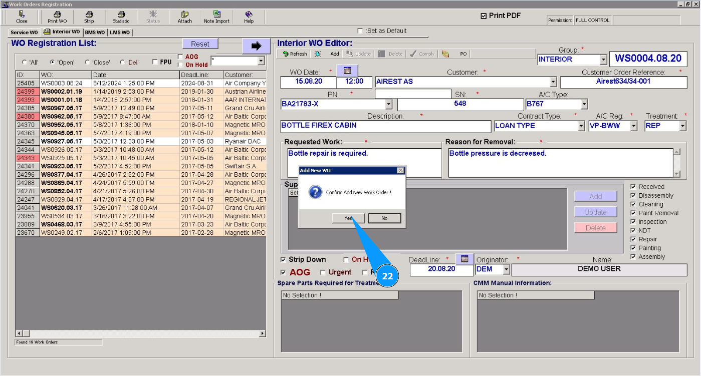 23. Check that the newly created WO is displayed in the window "WO Registration List".