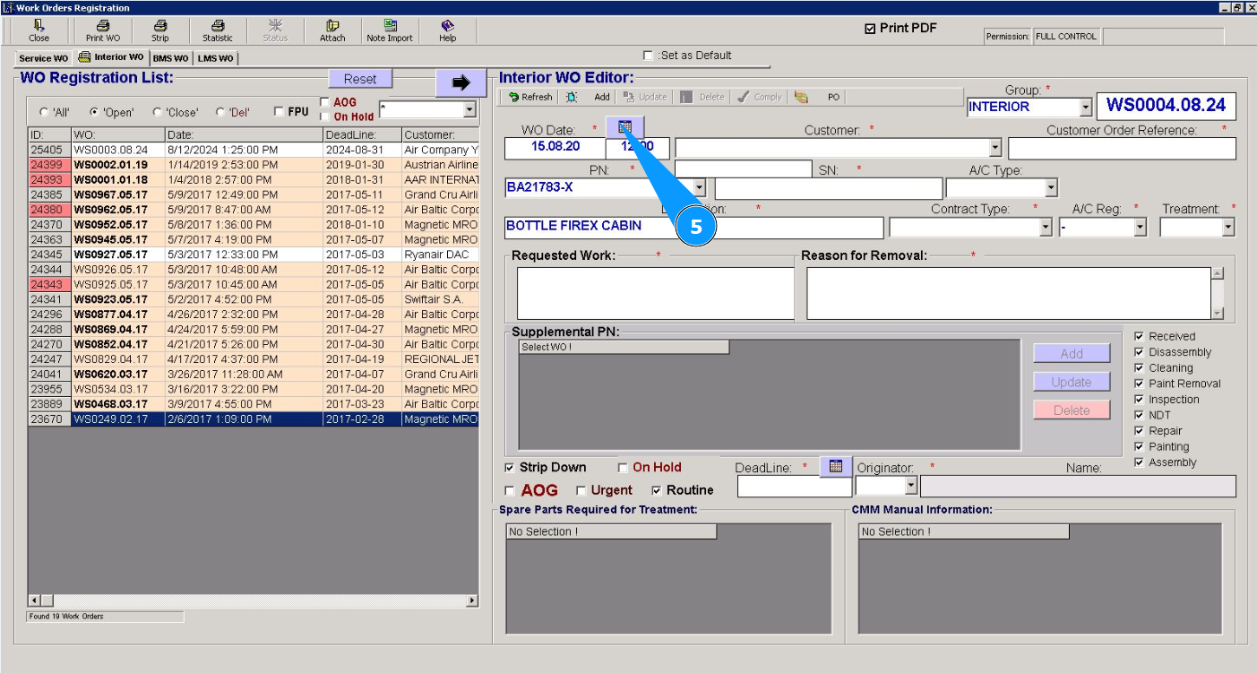 5. The creation date of the work order for interior equipment is set to today's date by default. If necessary, change it in the calendar. Note: The work order number will be created automatically by the program in the field "WO Number".