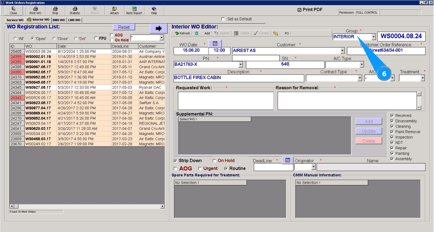 Note: Creating an interior work order is possible from the tab "WO" or from the submodule "WO".
