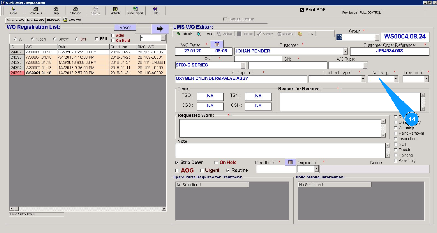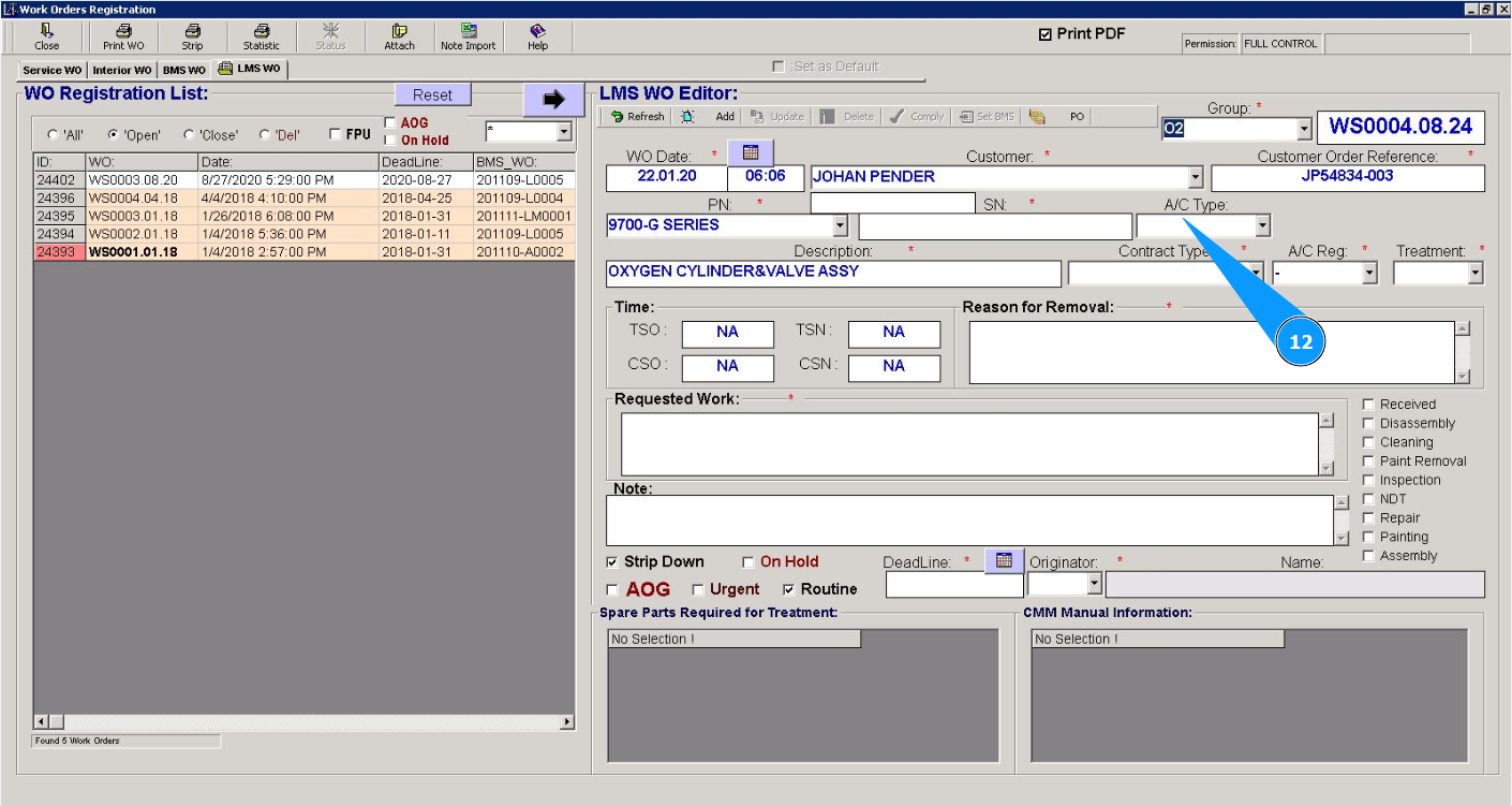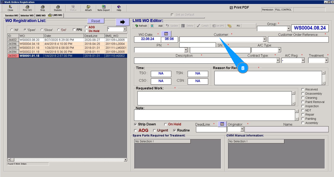 Note: Creating a Line Maintenace Shop WO is possible from the tab "WO" or via using the submodule "WO".