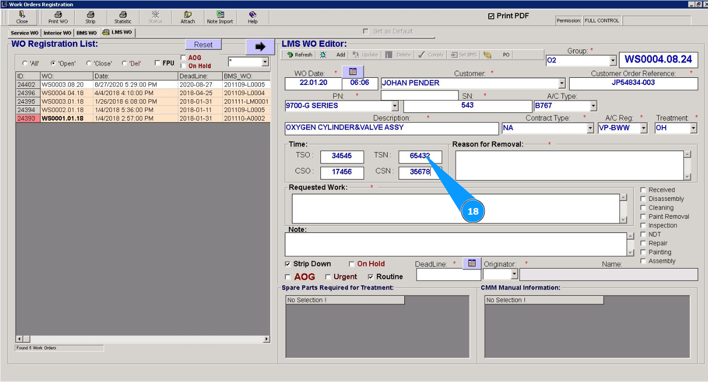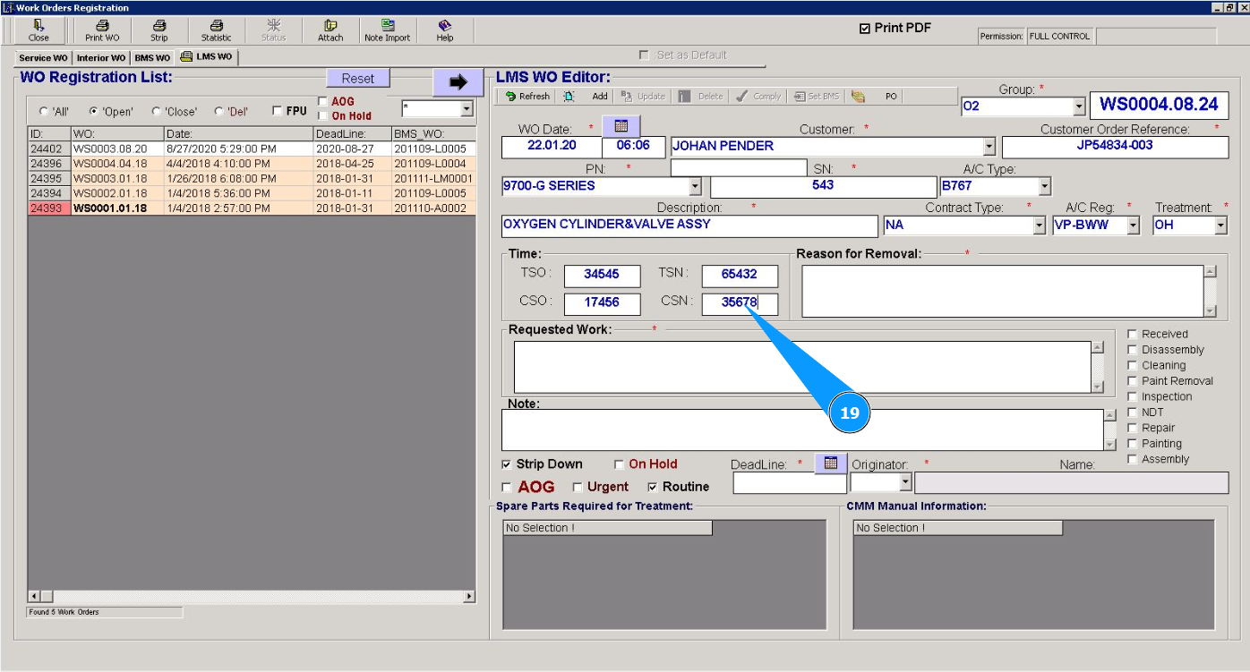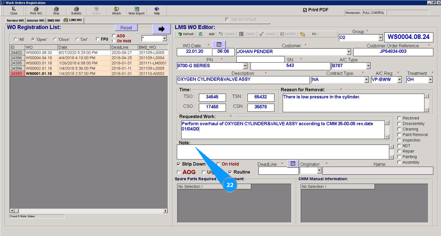 Note: Creating a Line Maintenace Shop WO is possible from the tab "WO" or via using the submodule "WO".