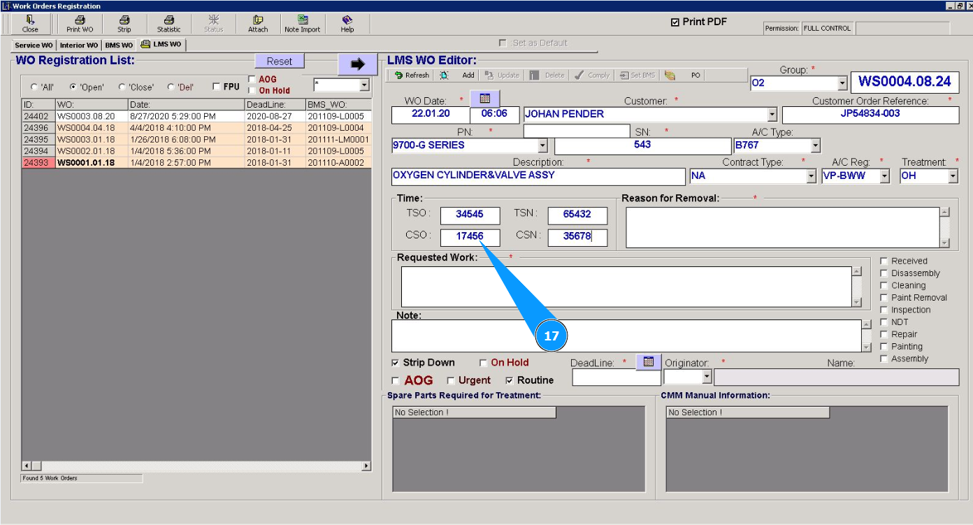 17. If necessary, enter the operating time of the component since the last overhaul in cycles in the field "CSO".
