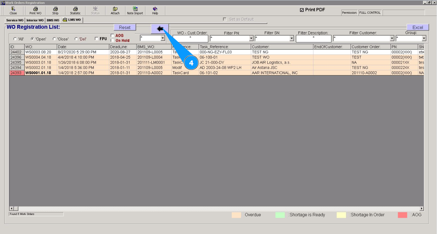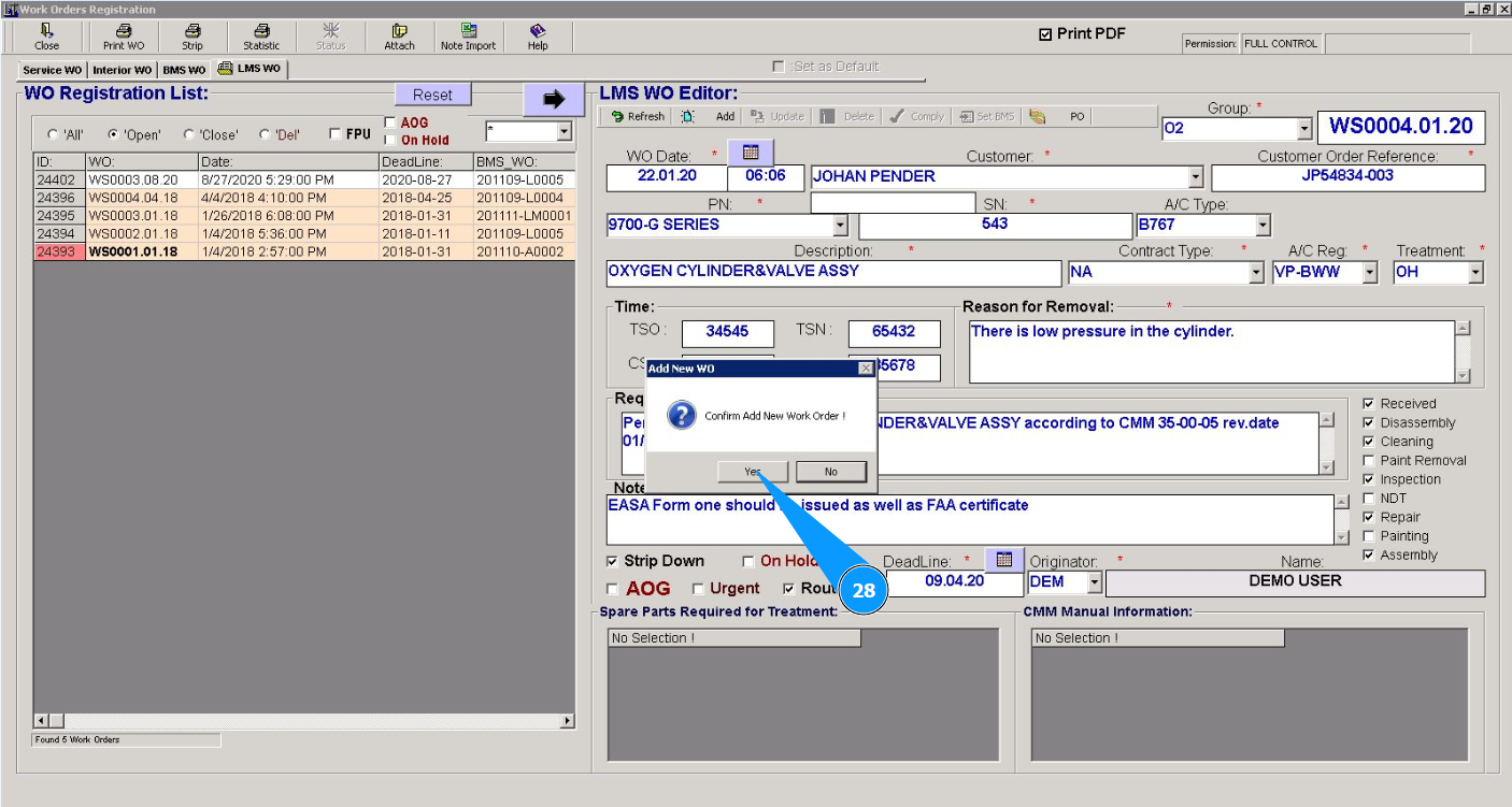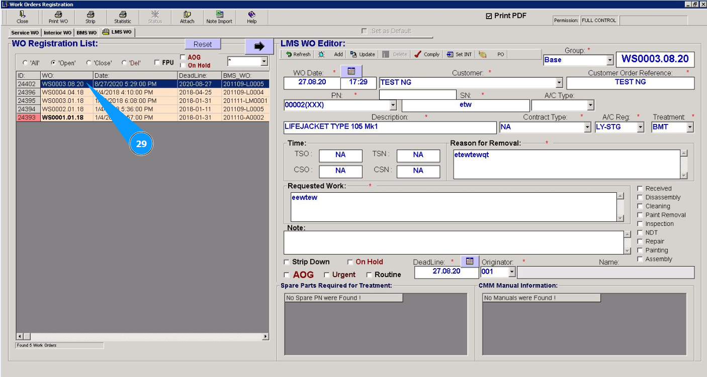 29. Check that the newly created WO is displayed in the window "WO Registration List".