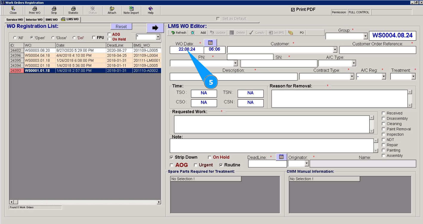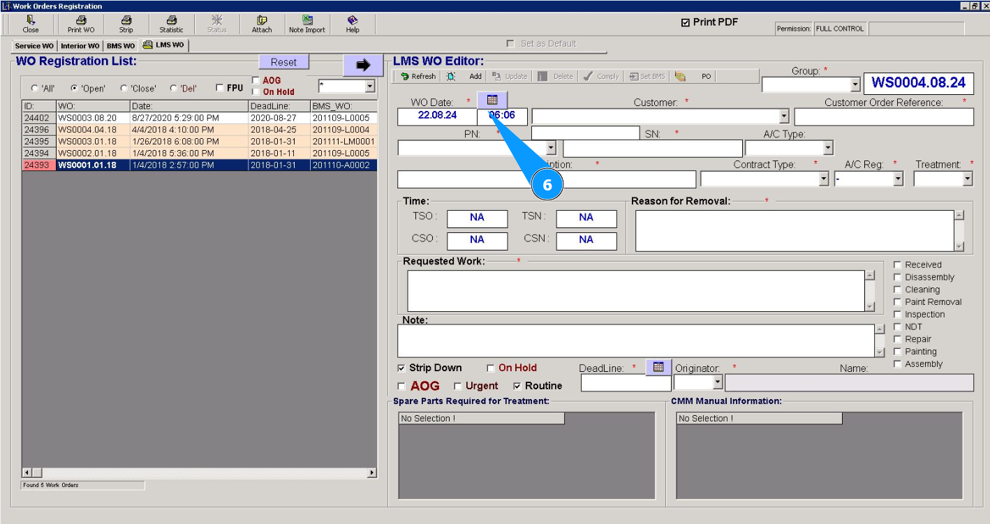 5. The creation date of Line Maintenace Shop WO is set to today's date by default. If necessary, change it in the calendar. Note: The work order number will be created automatically by the program.