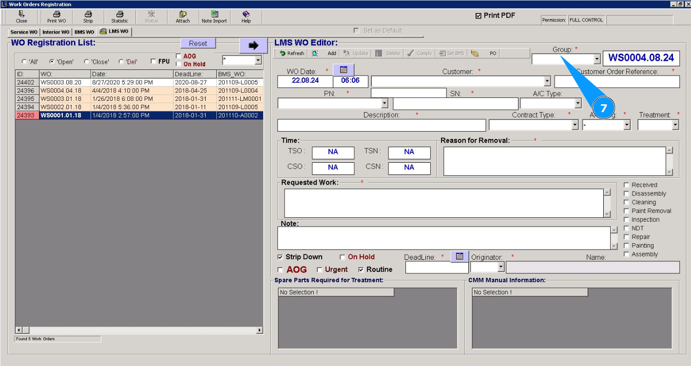 7. Select the work order group from the dropdown list in the field "Group".