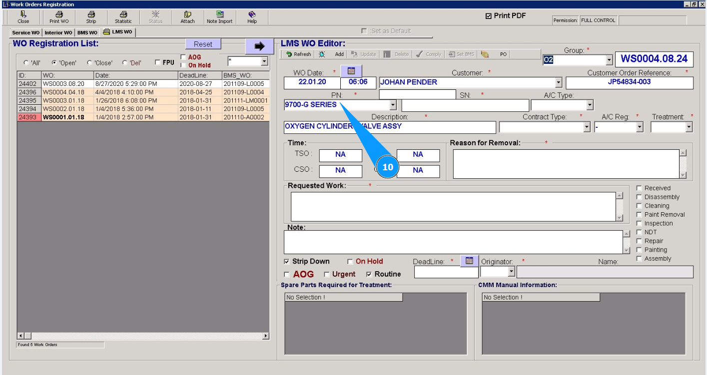 10. Select from the dropdown list the part number of the component to perform the work in the field "PN". Note: The description of the selected component will be entered by the program automatically in the field "Description".