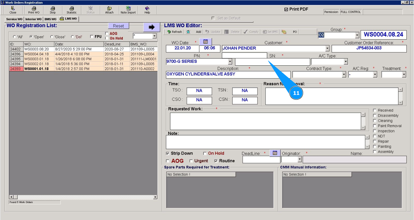 11. Enter the serial number of the component to perform the work in the field "SN".