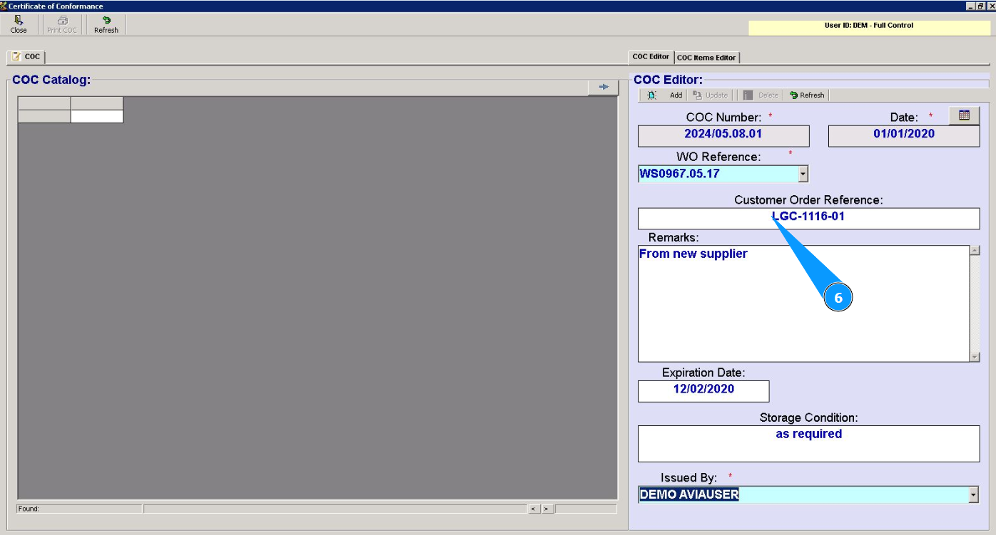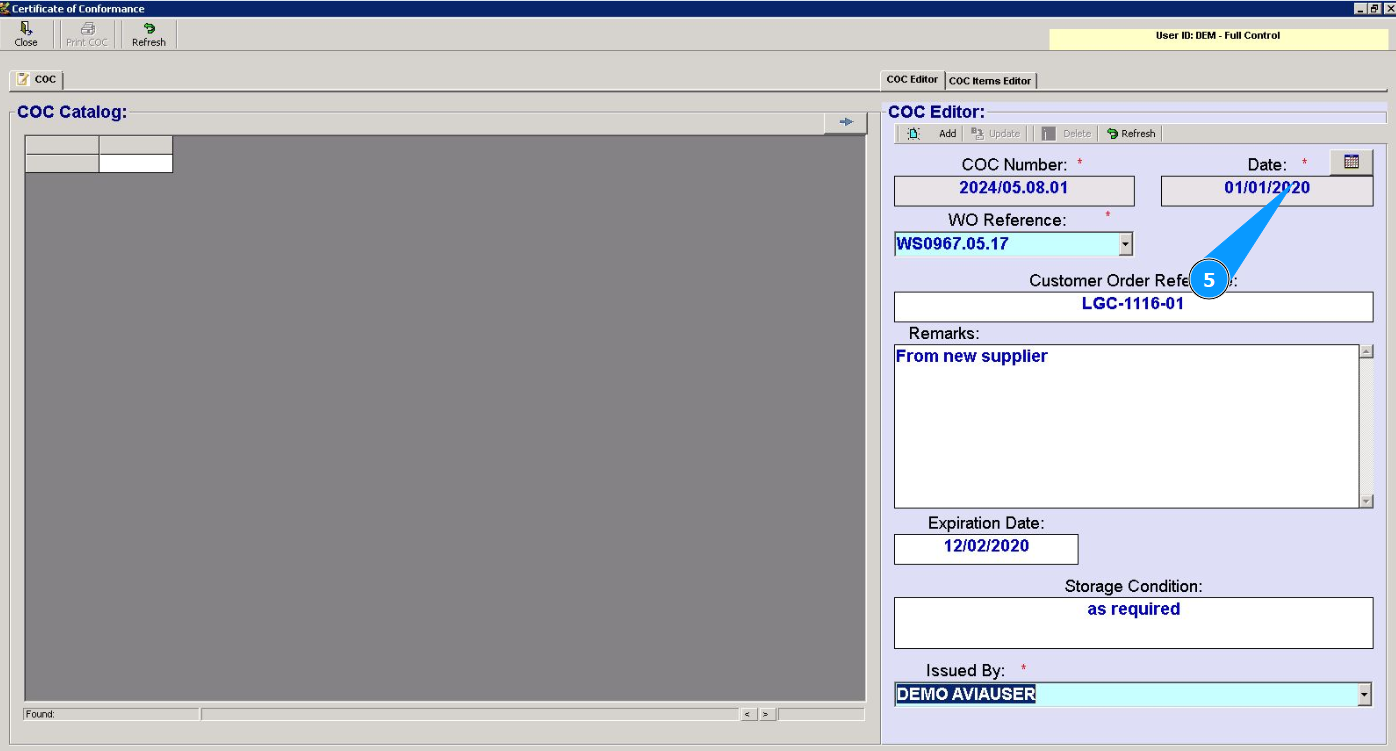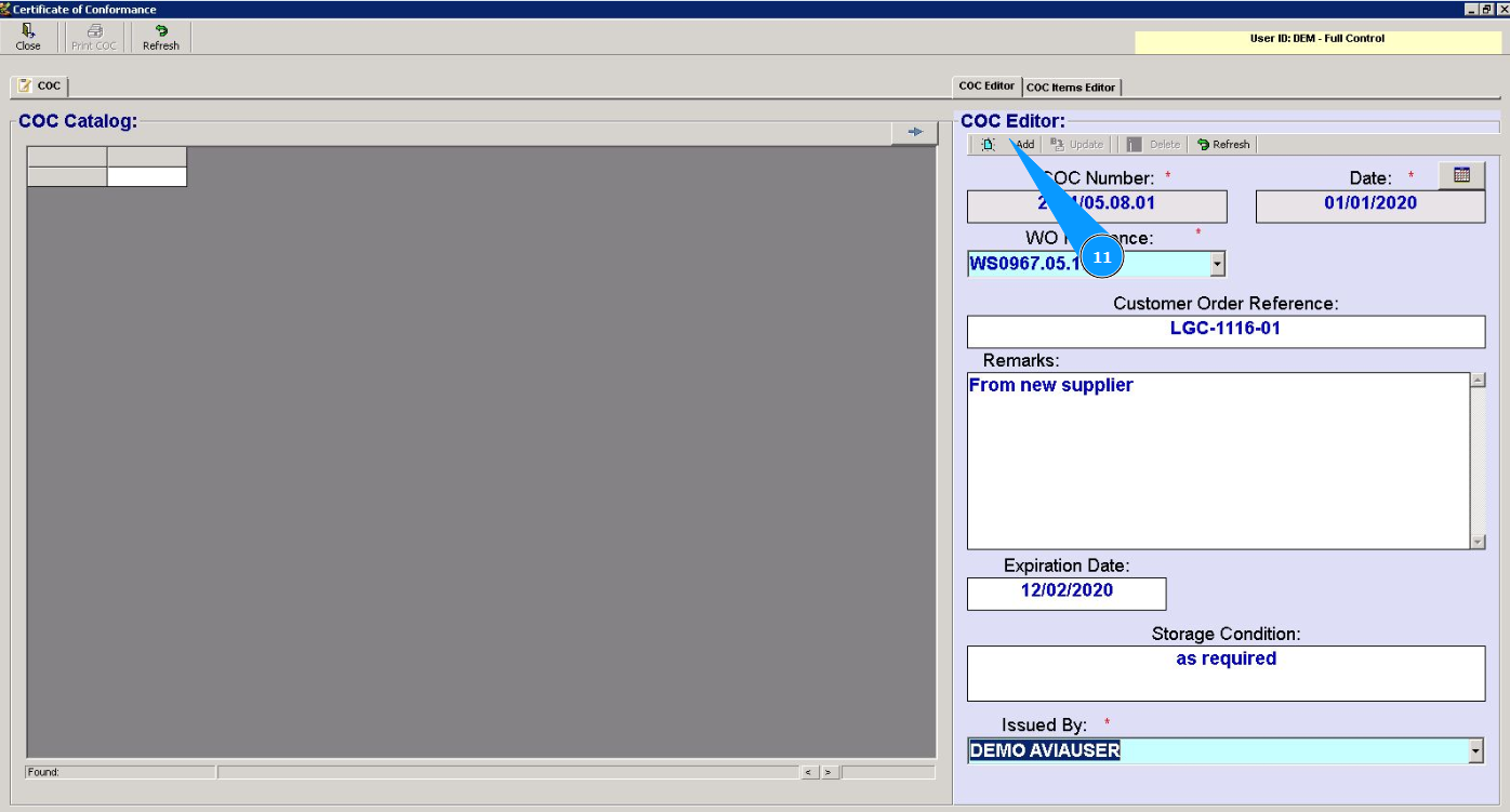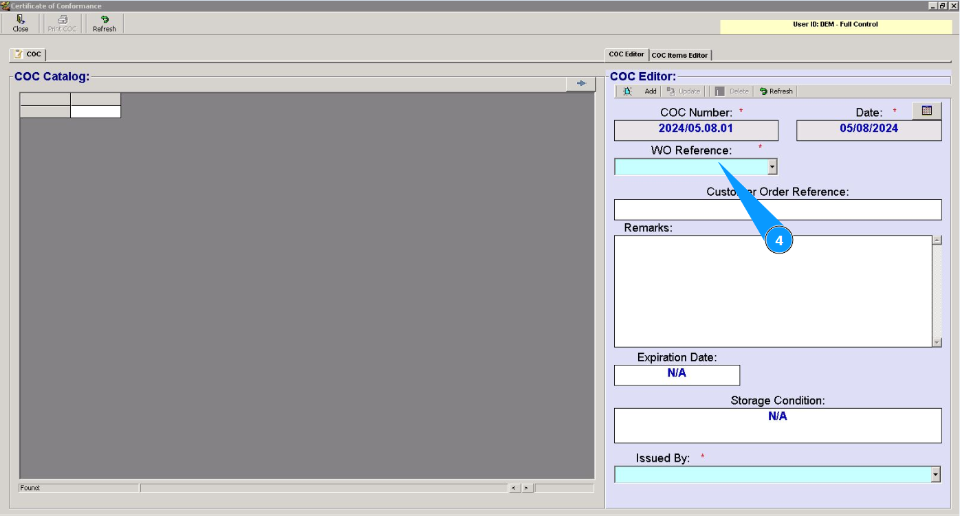 4. Select the work order number from the dropdown list in the field "WO Reference". Note: The certificate number will be entered automatically in the field "CoC Number".