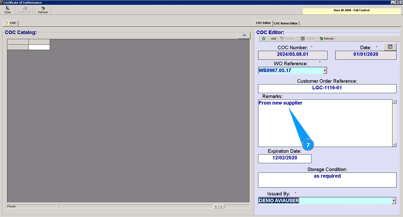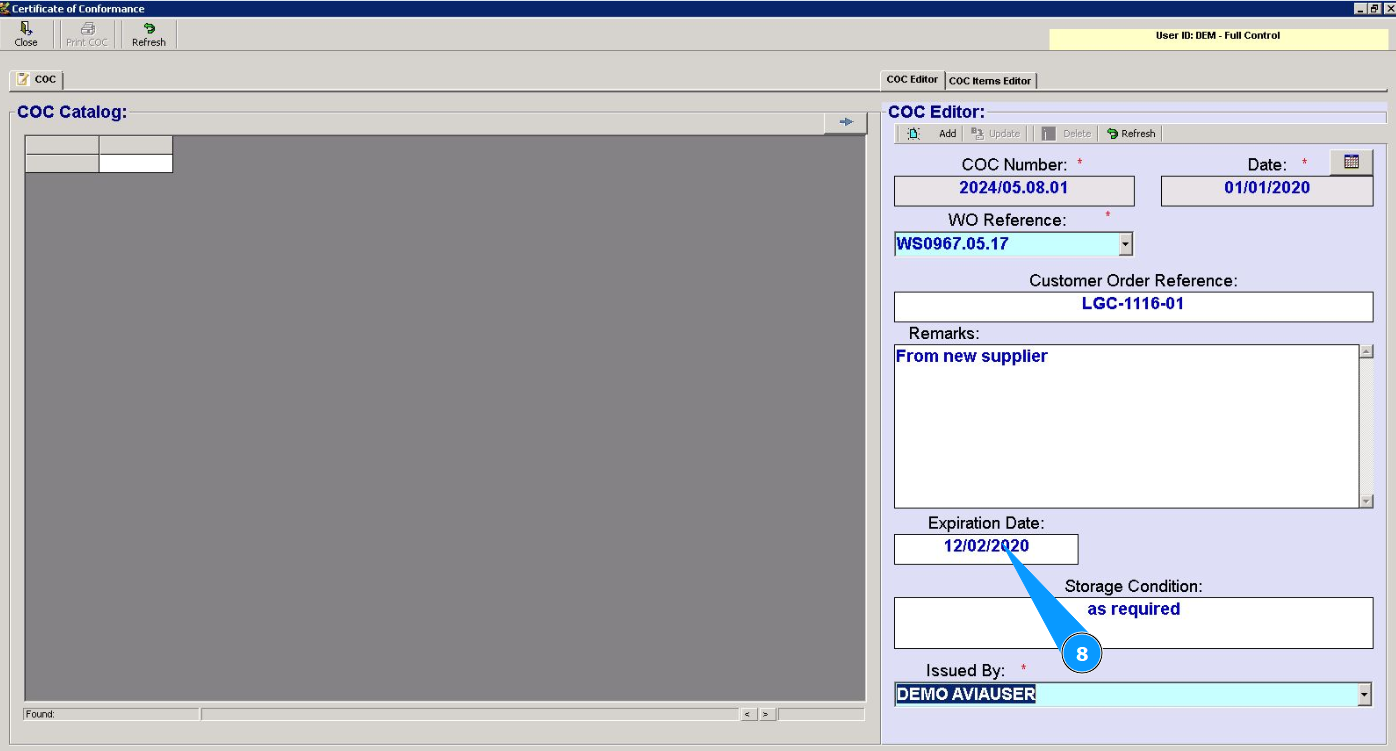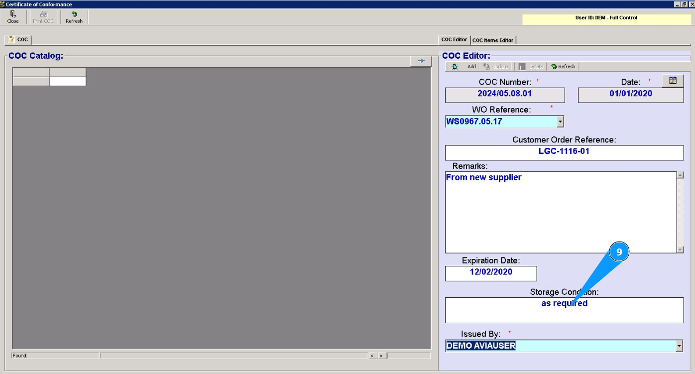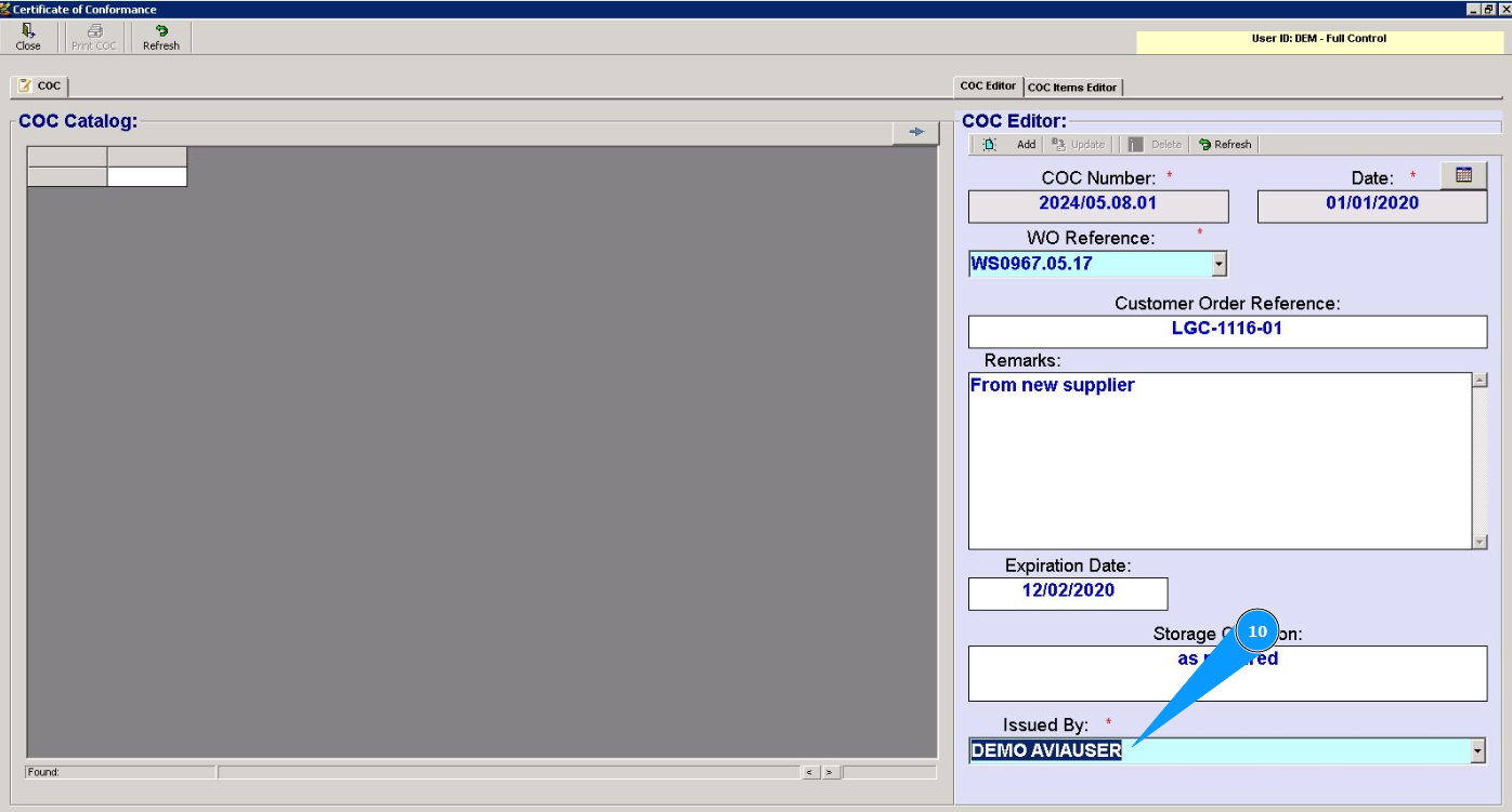 4. Select the work order number from the dropdown list in the field "WO Reference". Note: The certificate number will be entered automatically in the field "CoC Number".