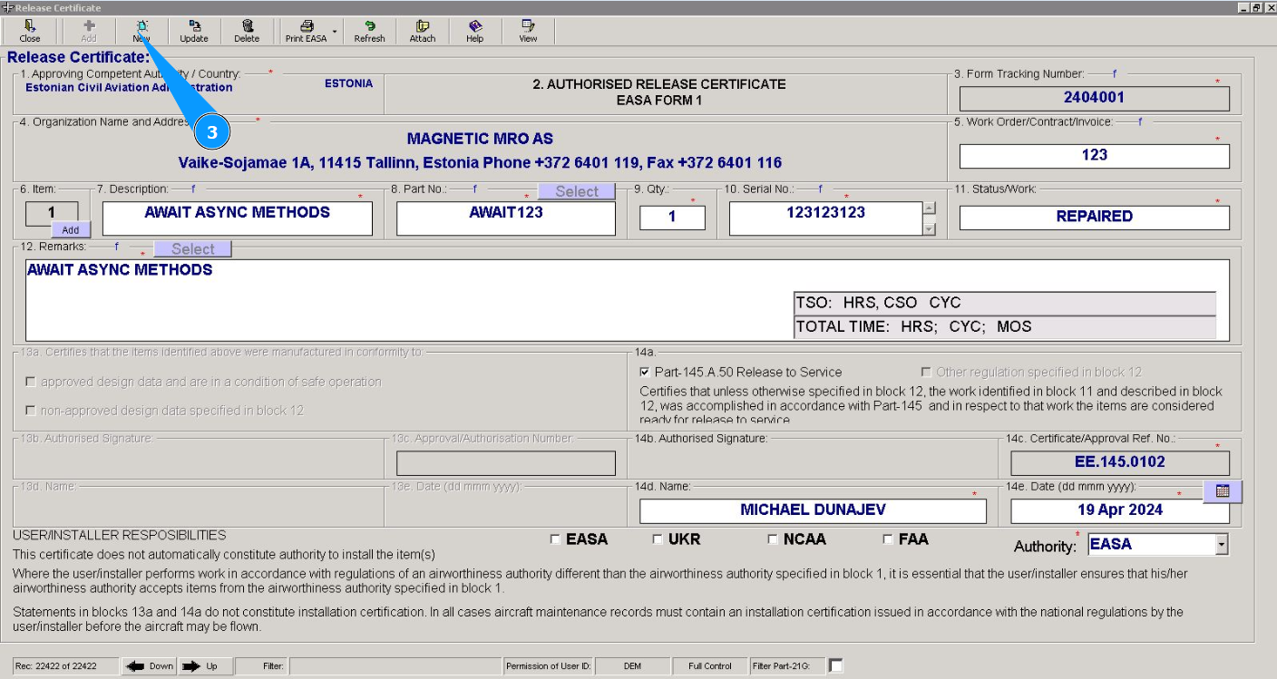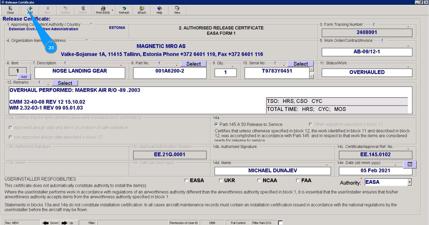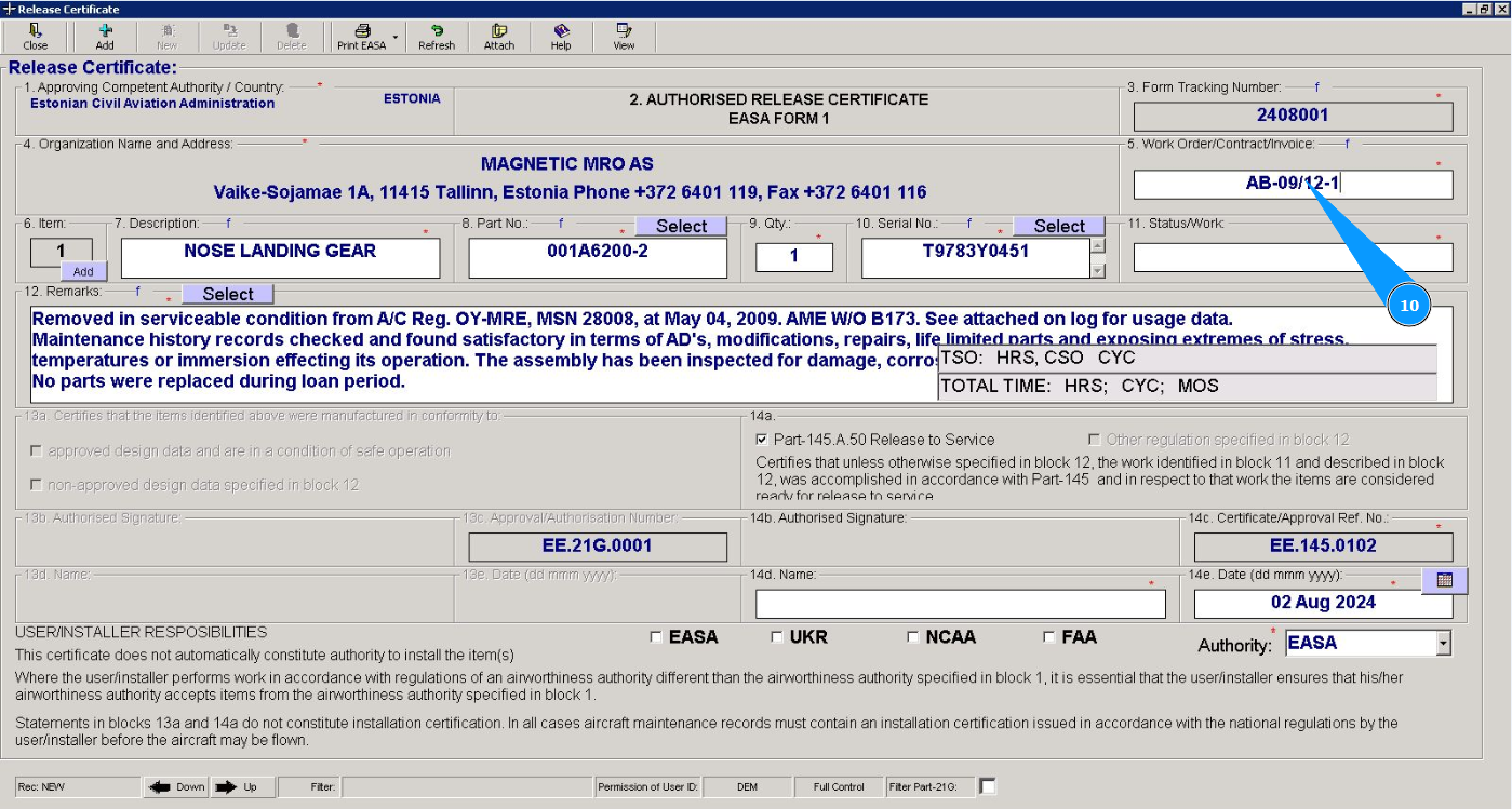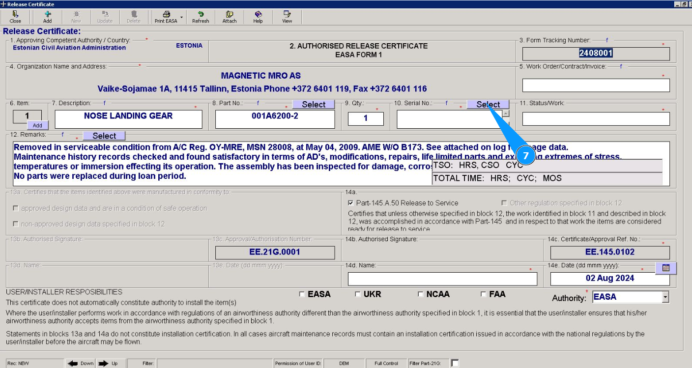 Note: You can issue a component release certificate from the tab "Release Certificate" or by opening the submodule "EASA Form".