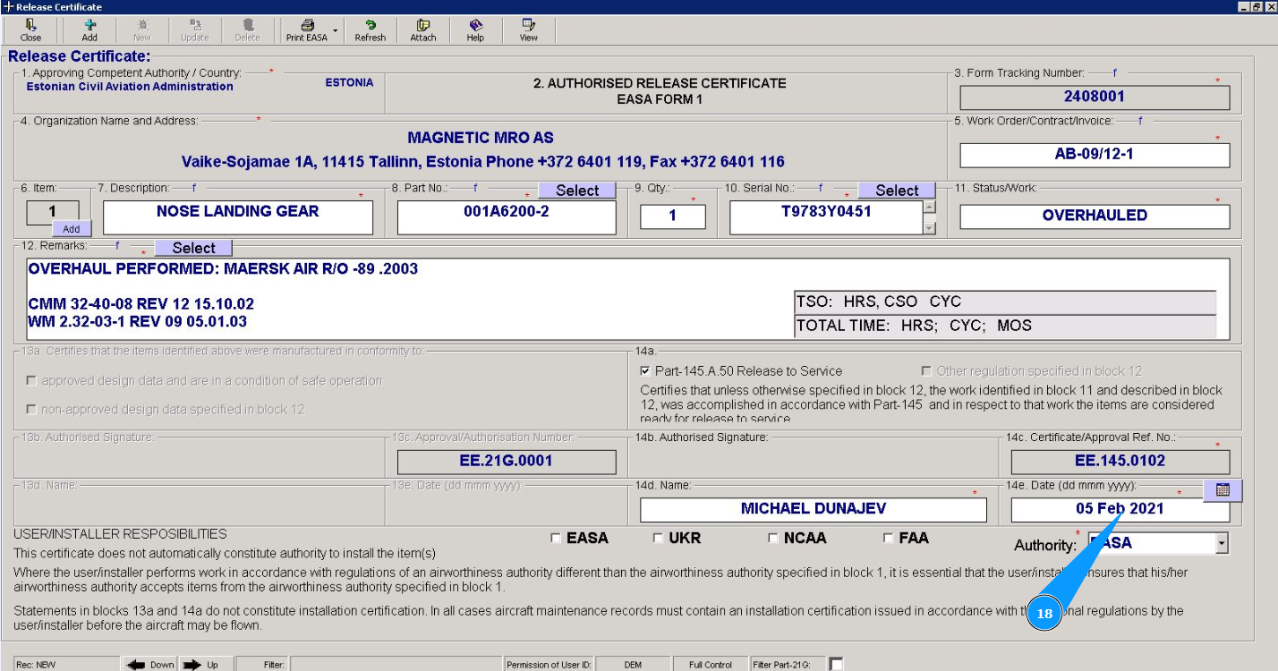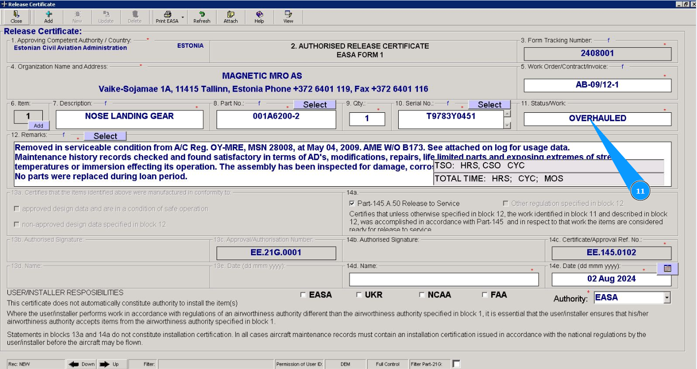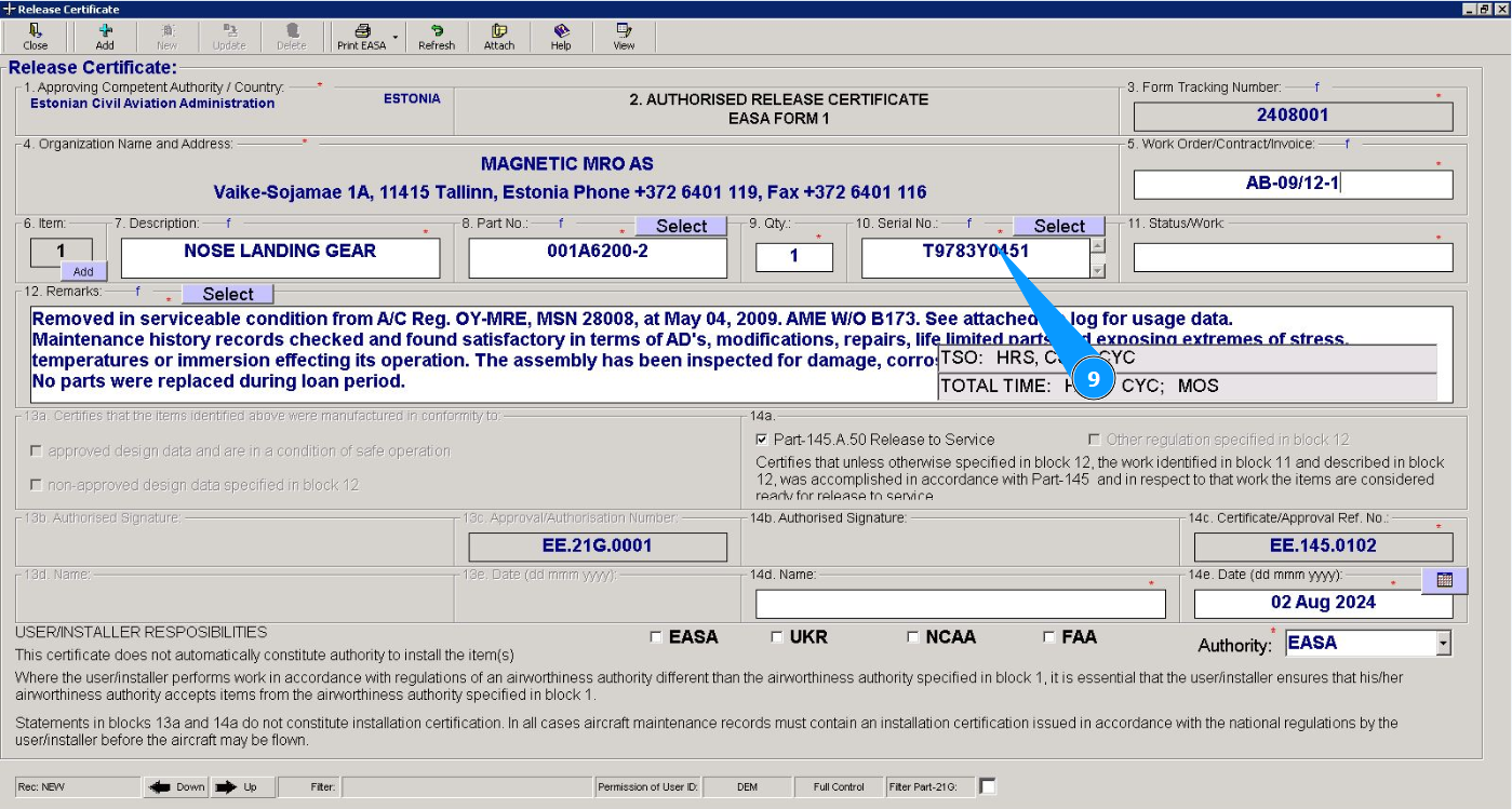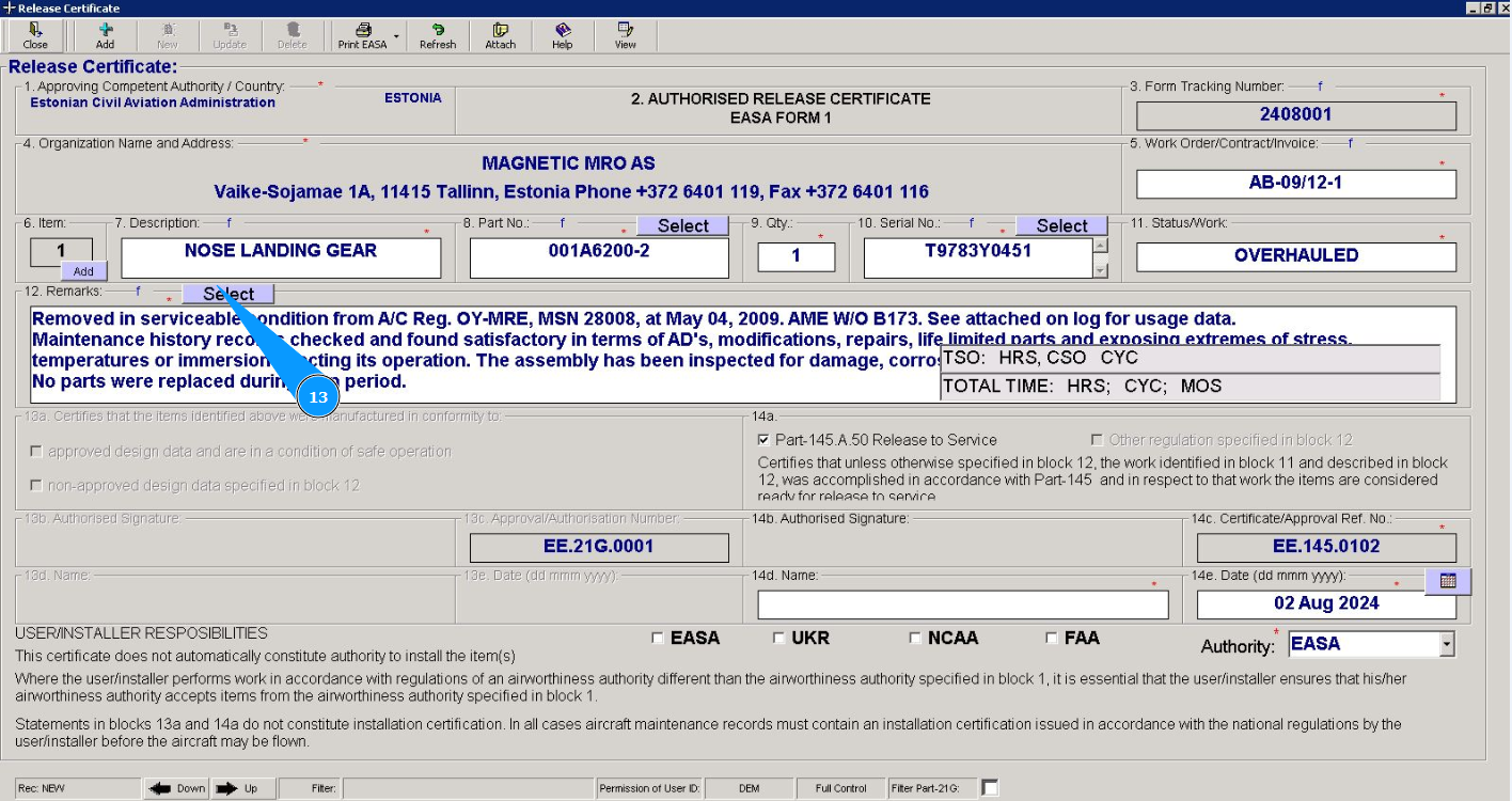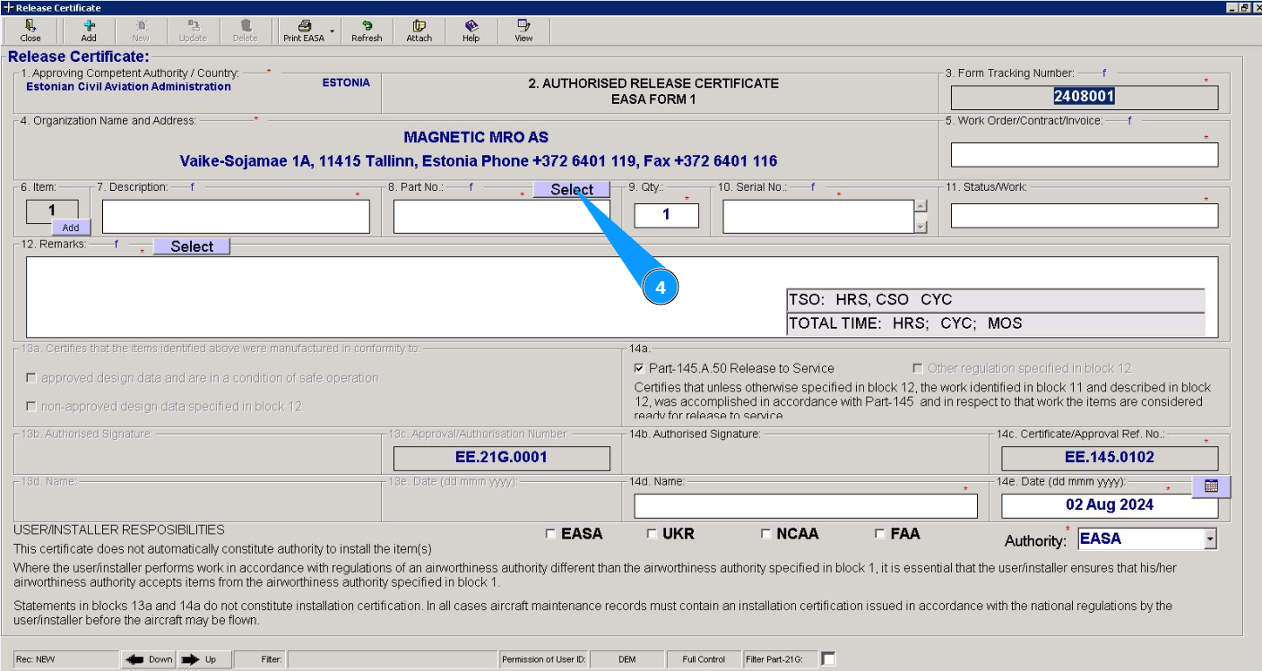 Note: You can issue a component release certificate from the tab "Release Certificate" or by opening the submodule "EASA Form".