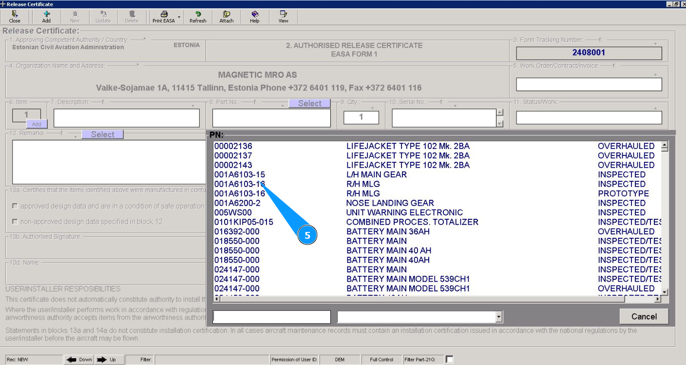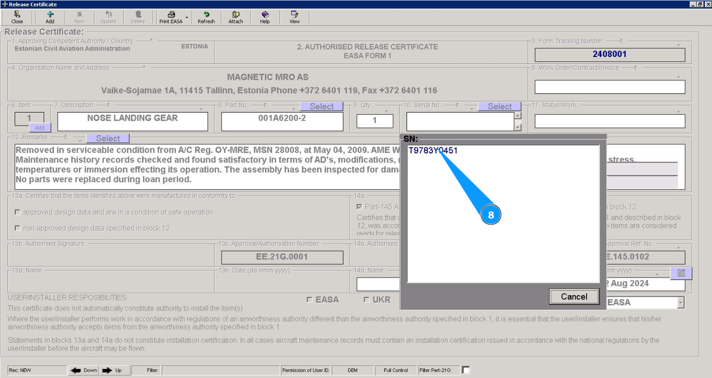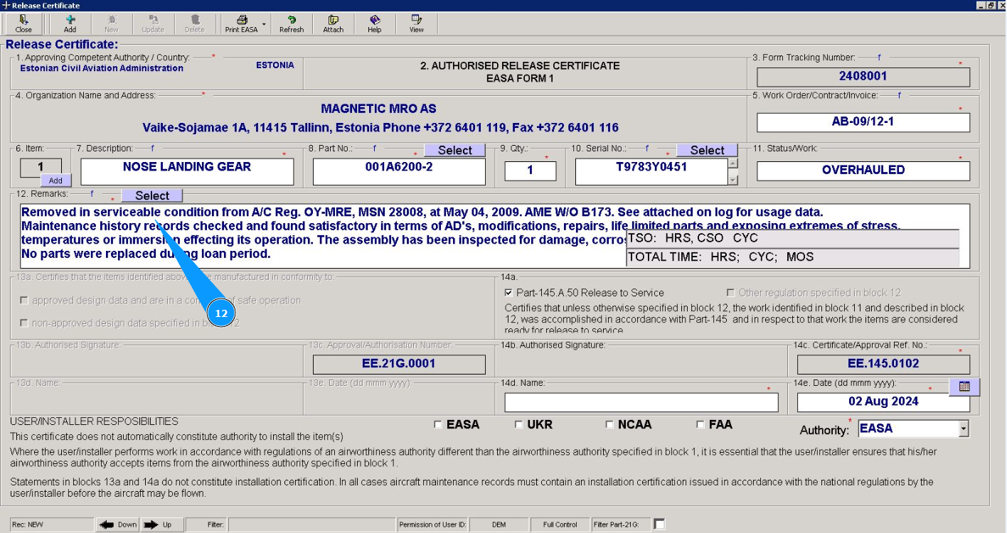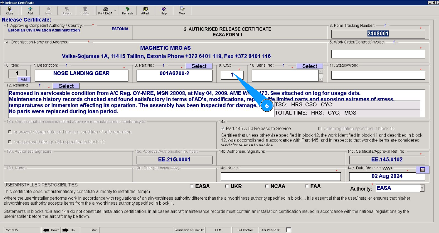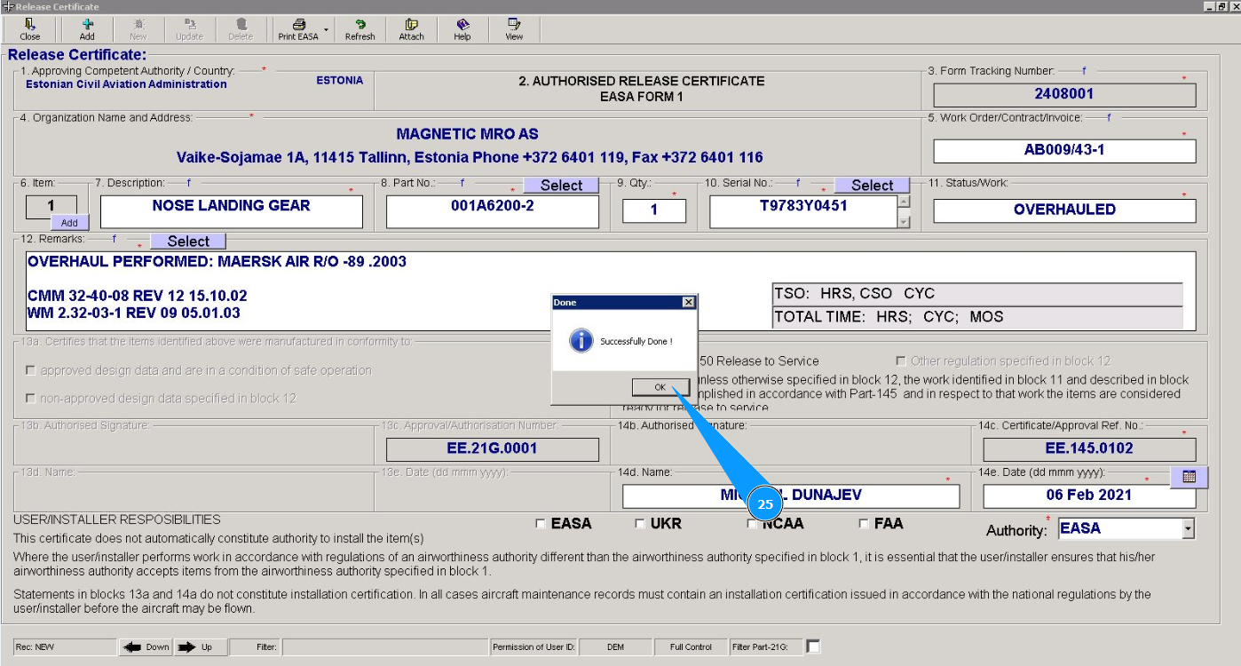 Note: You can issue a component release certificate from the tab "Release Certificate" or by opening the submodule "EASA Form".