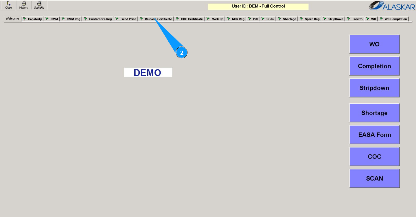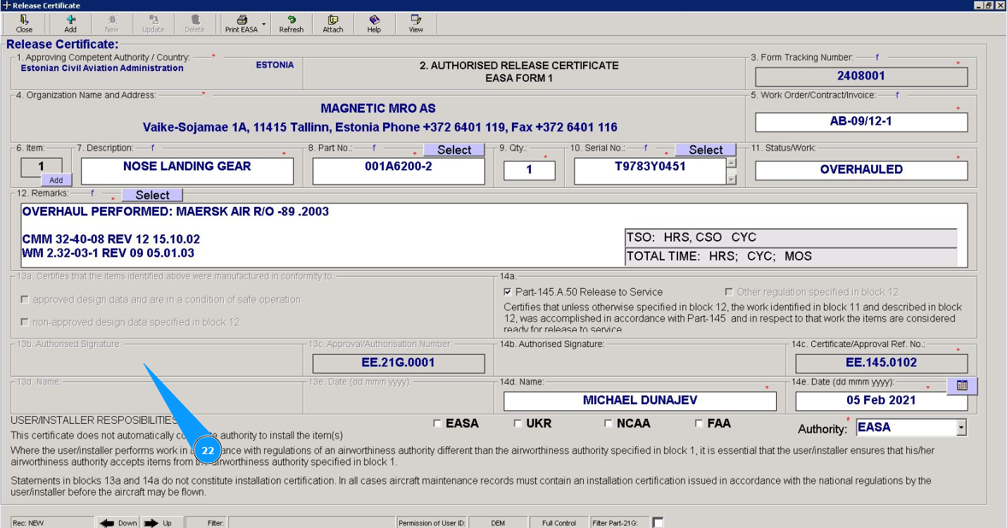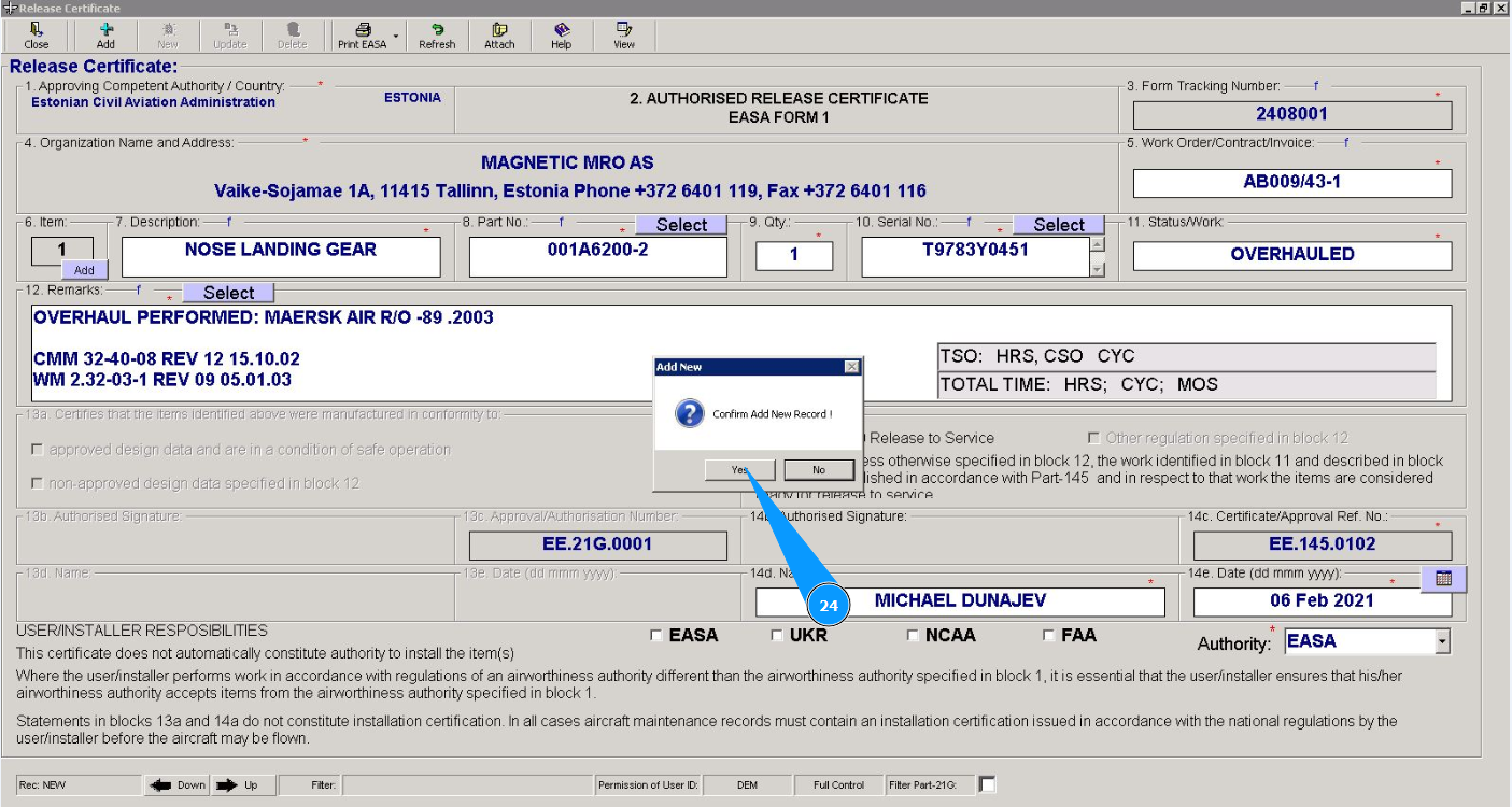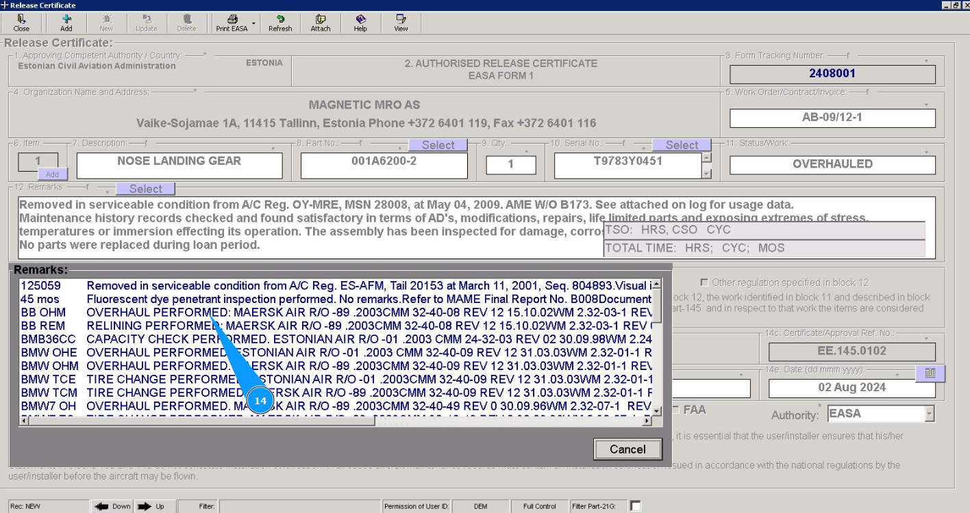 Note: You can issue a component release certificate from the tab "Release Certificate" or by opening the submodule "EASA Form".