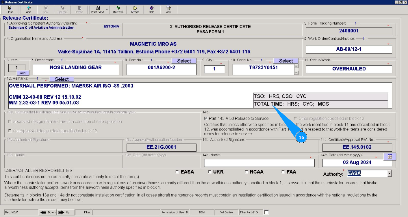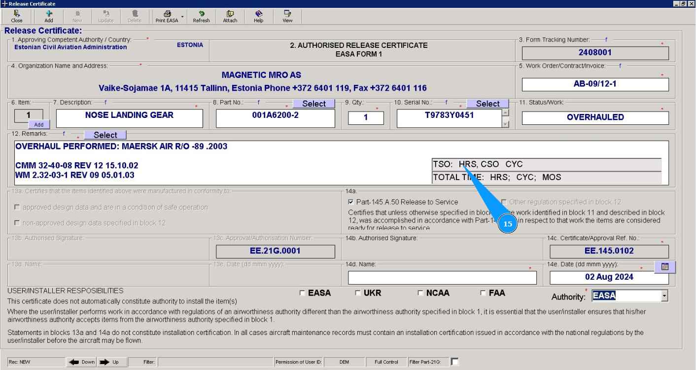 15. If necessary, enter the operating time of the component since the date of the last overhaul in the field "TSO".