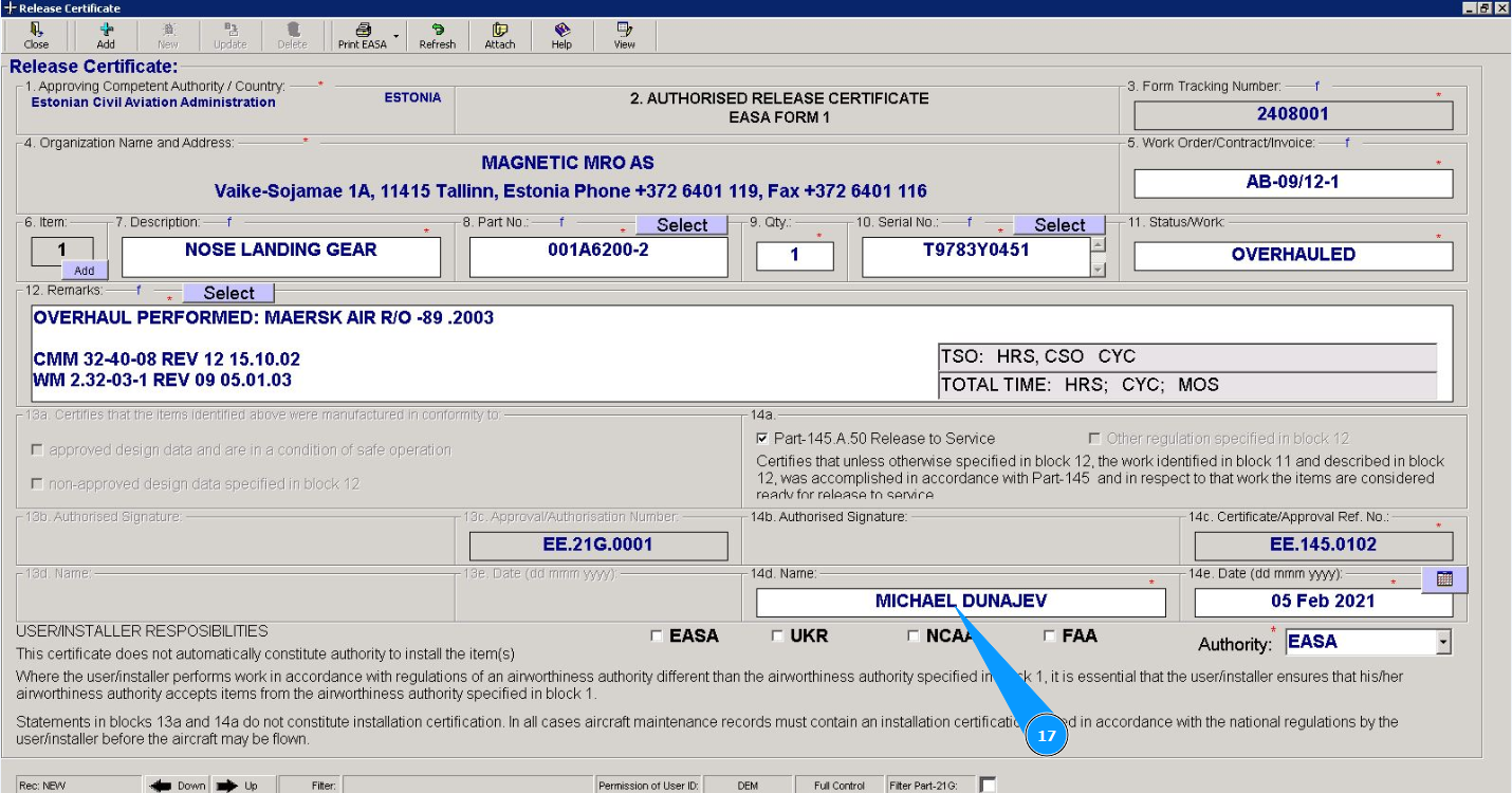 17. Click in the field "Name" and select from the dropdown list the personnel who certified the component and issued the certificate. Note: The current approval certificate number will be entered automatically in the field "Certificate/Approval Ref. No.".