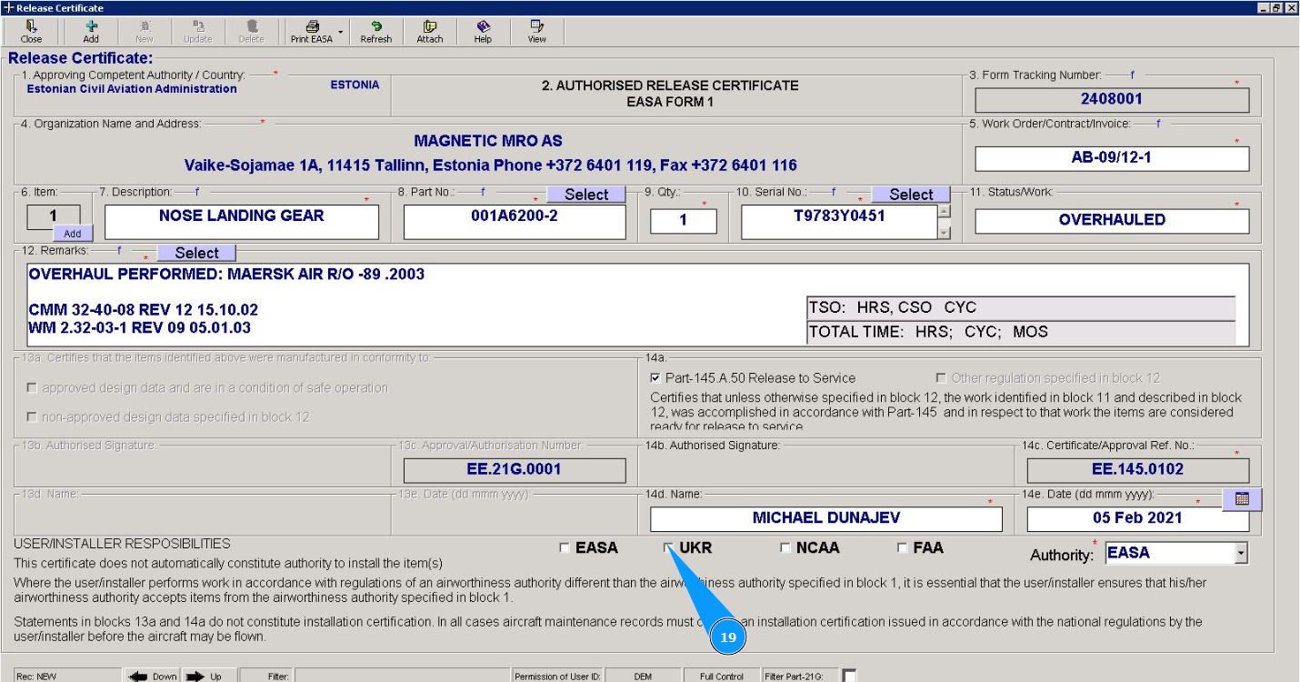 19. If necessary, tick the aviation authorities in the fields "EASA", "UKR", "NCAA" and "FAA".