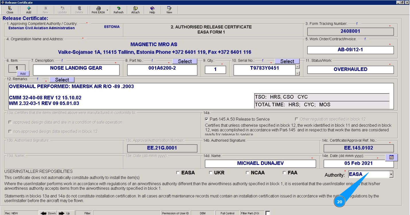 20. Select the aviation authority from the dropdown list in the field "Authority".